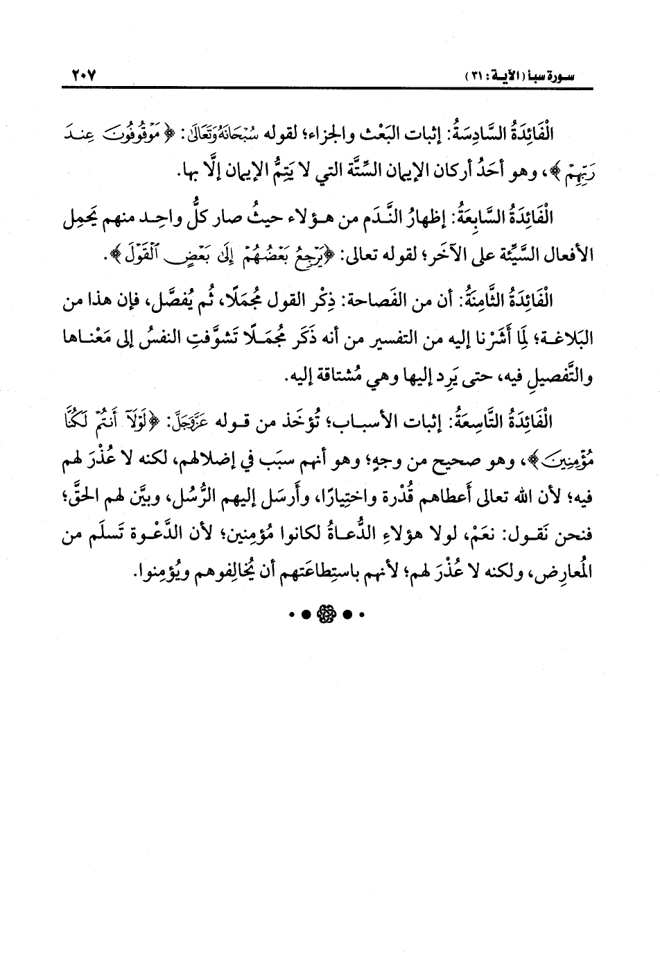 الْفَائِدَةُ السَّادِسَةُ: إثبات البَعْث والجزاء؛ لقوله سُبْحَانَهُ وَتَعَالَى: {مَوْقُوفُونَ عِنْدَ رَبِّهِمْ}، وهو أحَدُ أركان الإيمان السِّتَّة التي لا يَتِمُّ الإيمان إلَّا بها.