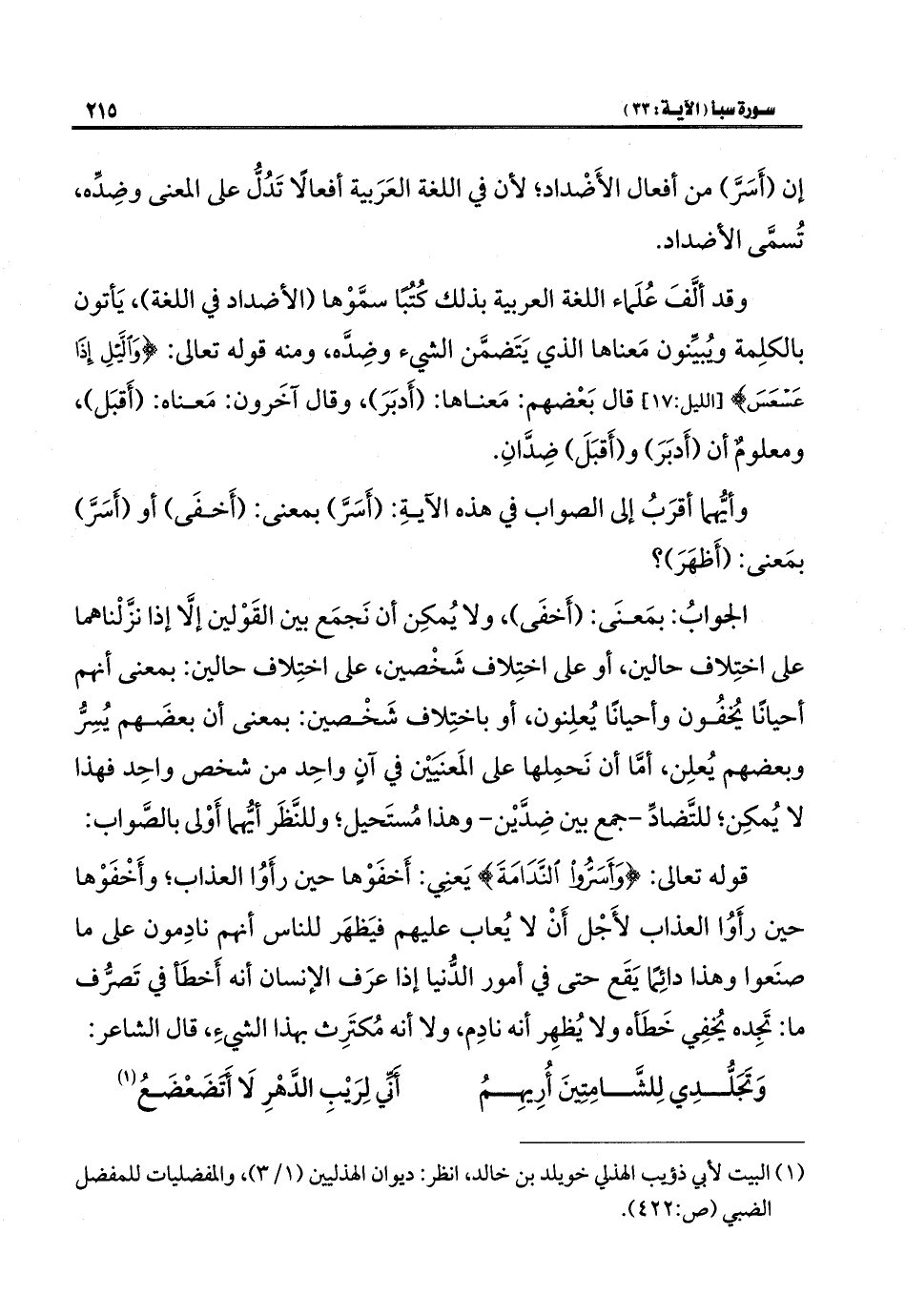 إن (أَسَرَّ) من أفعال الأَضْداد؛ لأن في اللغة العَرَبية أفعالًا تَدُلُّ على المعنى وضِدِّه، تُسمَّى الأضداد.