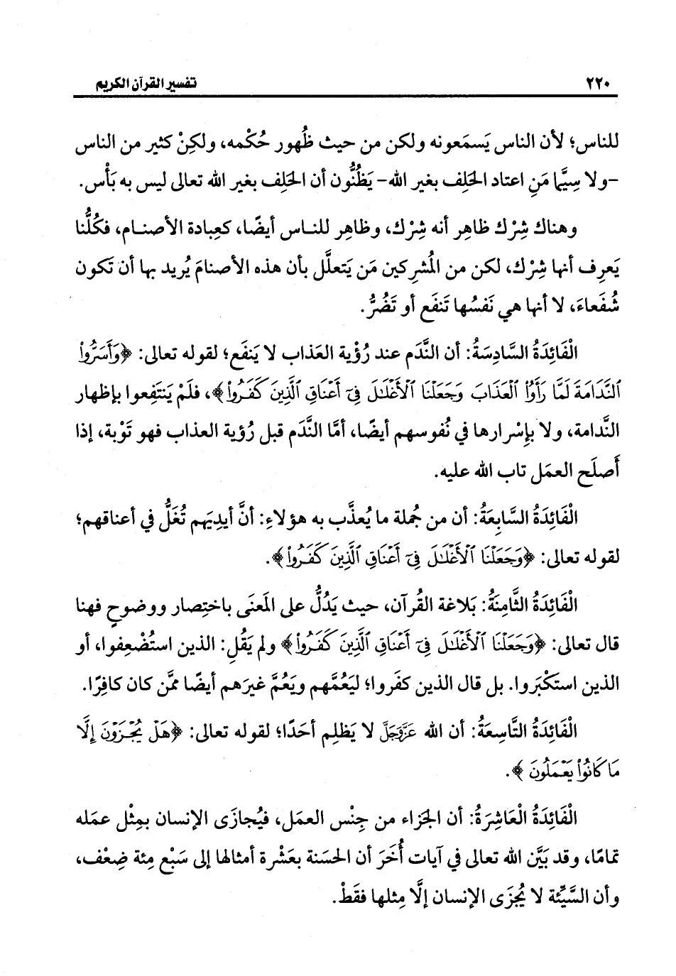 الْفَائِدَةُ الثَّامِنةُ: بَلاغة القُرآن، حيث يَدُلُّ على المَعنَى باختِصار ووضوحٍ فهنا قال تعالى: {وَجَعَلْنَا الْأَغْلَالَ فِي أَعْنَاقِ الَّذِينَ كَفَرُوا} ولم يَقُلِ: الذين استُضعِفوا، أو الذين استكْبَروا. بل قال الذين كفَروا؛ ليَعُمَّهم وَيعُمَّ غيرَهم أيضًا ممَّن كان كافِرًا.