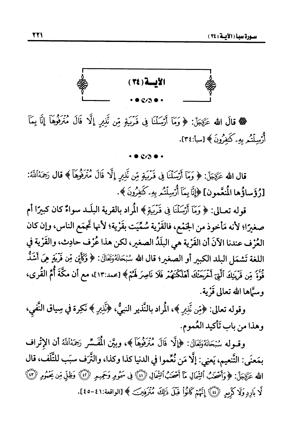 وقوله سُبْحَانَهُ وَتَعَالَى: {إِلَّا قَالَ مُتْرَفُوهَا}، وبيَّن المُفَسِّر رَحِمَهُ اللهُ أن الاِتْراف بمَعنَى: التَّنعيم، يَعنِي: إلَّا مَن نُعِّموا في الدنيا كذا وكذا، والتَّرَف سبَب للتَّلَف، قال الله عَزَّ وَجَلَّ: {وَأَصْحَابُ الشِّمَالِ مَا أَصْحَابُ الشِّمَالِ (٤١) فِي سَمُومٍ وَحَمِيمٍ (٤٢) وَظِلٍّ مِنْ يَحْمُومٍ (٤٣) لَا بَارِدٍ وَلَا كَرِيمٍ (٤٤) إِنَّهُمْ كَانُوا قَبْلَ ذَلِكَ مُتْرَفِينَ} [الواقعة: ٤١ - ٤٥].
