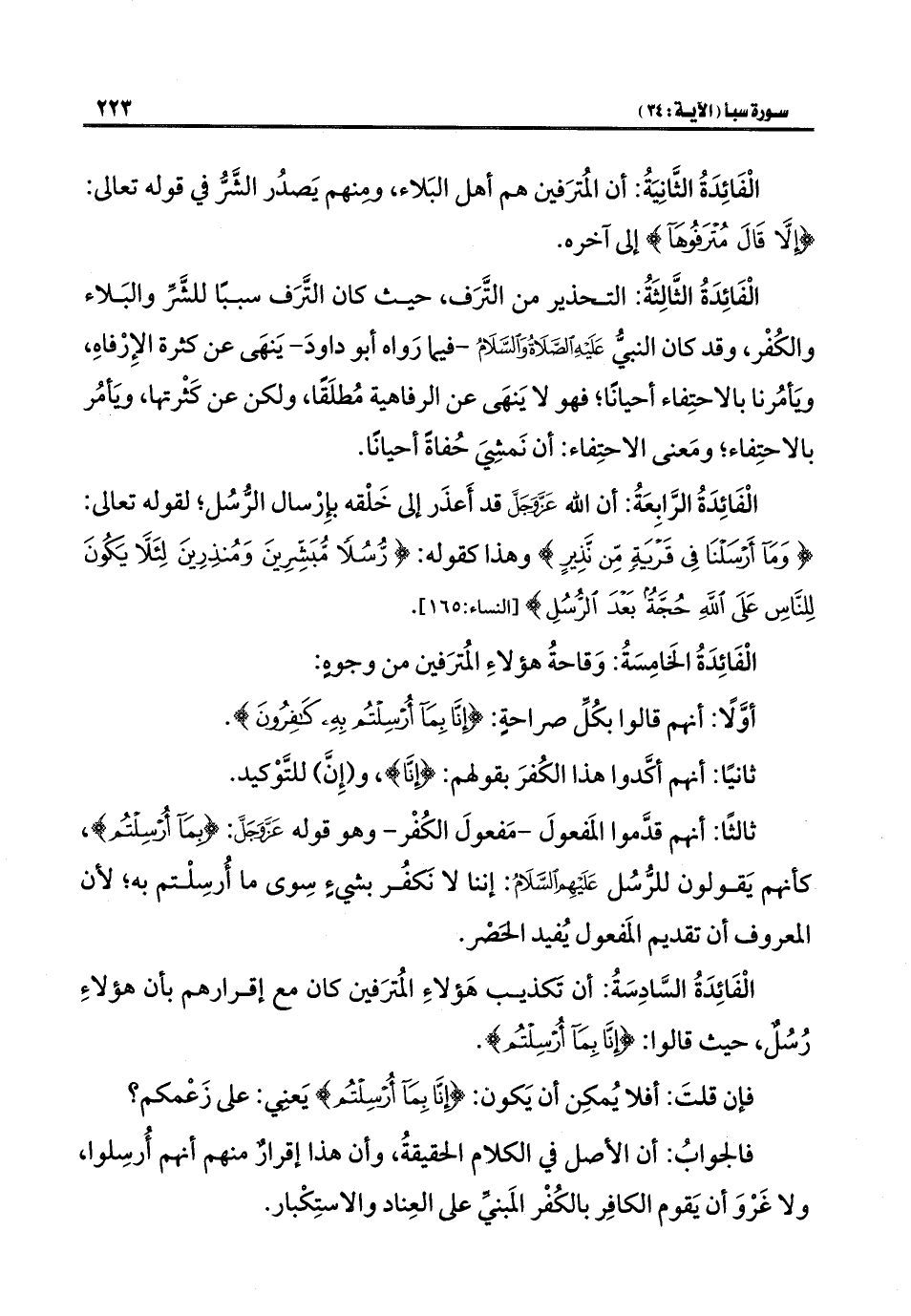 الْفَائِدَةُ الثَّانِيَةُ: أن المُترَفين هم أهل البَلاء، ومِنهم يَصدُر الشَّرُّ في قوله تعالى: {إِلَّا قَالَ مُتْرَفُوهَا} إلى آخره.