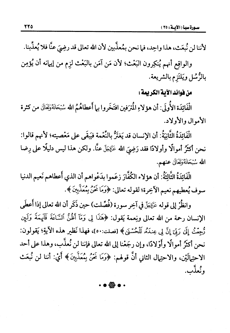 الْفَائِدَةُ الثَّانِيَةُ: أن الإنسان قد يَغتَرُّ بالنِّعْمة فيَبقَى على مَعْصيته؛ لأنهم قالوا: نحن أكثَرُ أموالًا وأولادًا فقد رَضِيَ الله عَزَّ وَجَلَّ عنَّا. ولكن هذا ليس دليلًا على رِضا الله سُبْحَانَهُ وَتَعَالَى عنهم.