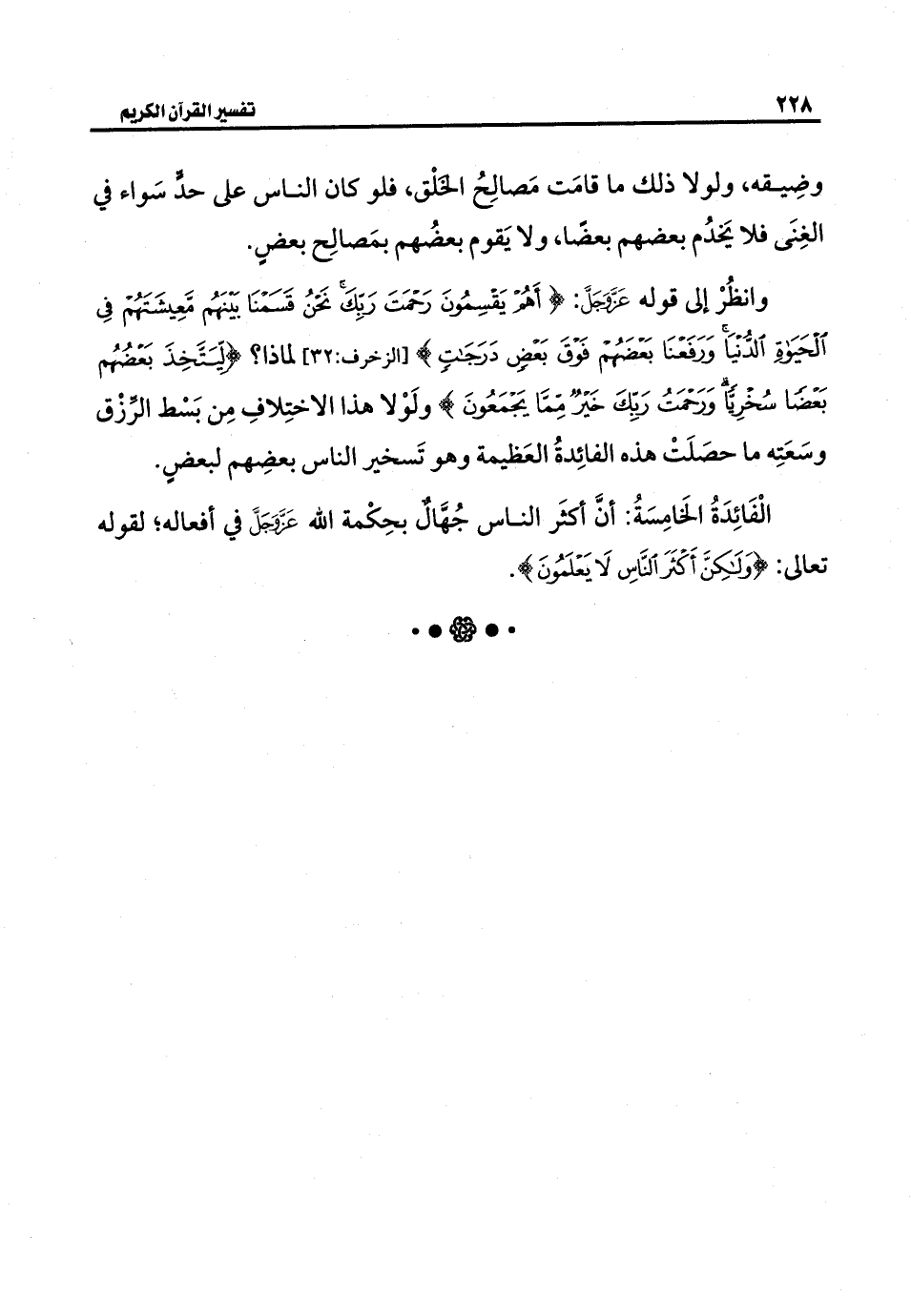 وانظُرْ إلى قوله عَزَّ وَجَلَّ: {أَهُمْ يَقْسِمُونَ رَحْمَتَ رَبِّكَ نَحْنُ قَسَمْنَا بَيْنَهُمْ مَعِيشَتَهُمْ فِي الْحَيَاةِ الدُّنْيَا وَرَفَعْنَا بَعْضَهُمْ فَوْقَ بَعْضٍ دَرَجَاتٍ} [الزخرف: ٣٢] لماذا؟ {لِيَتَّخِذَ بَعْضُهُمْ بَعْضًا سُخْرِيًّا وَرَحْمَتُ رَبِّكَ خَيْرٌ مِمَّا يَجْمَعُونَ} ولَوْلا هذا الاختِلافِ مِن بَسْط الرِّزْق وسَعَتِه ما حصَلَتْ هذه الفائِدةُ العَظيمة وهو تَسخير الناس بعضِهم لبعضٍ.