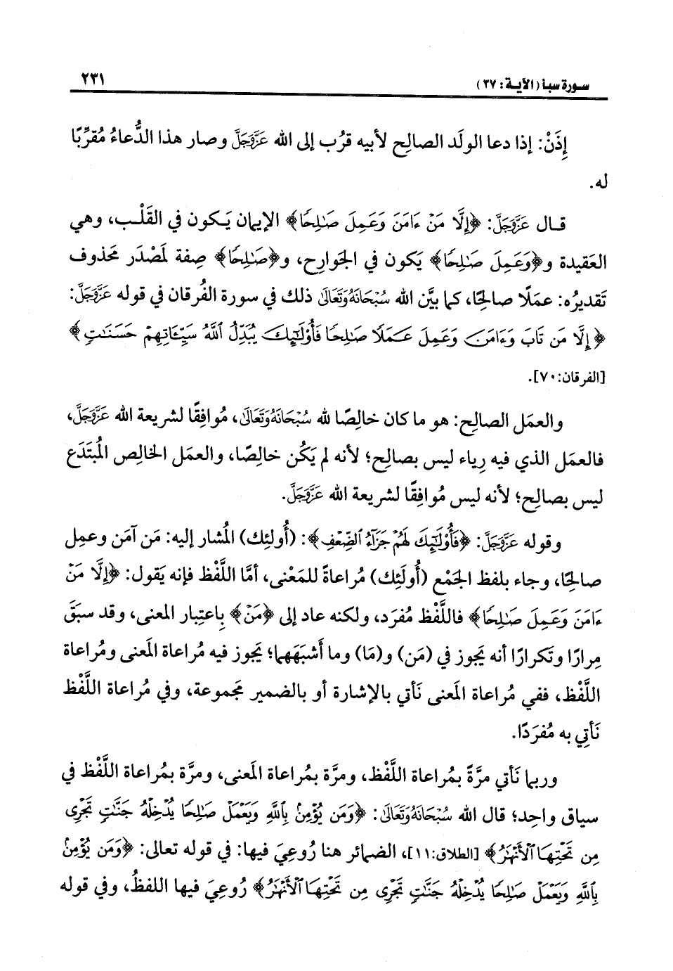وقوله عَزَّ وَجَلَّ: {فَأُولَئِكَ لَهُمْ جَزَاءُ الضِّعْفِ}: (أُولئِك) المُشار إليه: مَن آمَن وعمِل صالِحًا، وجاء بلفظ الجمْع (أُولَئِك) مُراعاةً للمَعْنى، أمَّا اللَّفْظ فإنه يَقول: {إِلَّا مَنْ آمَنَ وَعَمِلَ صَالِحًا} فاللَّفْظ مُفرَد، ولكنه عاد إلى {مَنْ} بِاعتِبار المعنى، وقد سبَقَ مِرارًا وتَكرارًا أنه يَجوز في (مَن) و (مَا) وما أَشبَهَهما؛ يَجوز فيه مُراعاة المَعنى ومُراعاة اللَّفْظ، ففي مُراعاة المَعنى نَأتي بالإشارة أو بالضمير مَجموعة، وفي مُراعاة اللَّفْظ نَأتِي به مُفرَدًا.