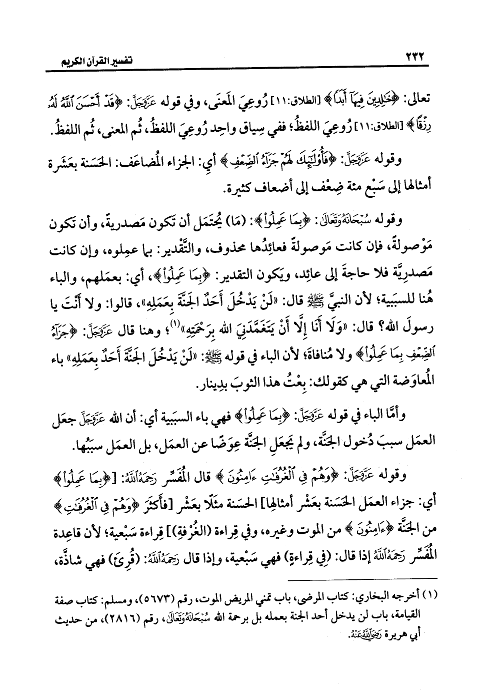 (¬١) أخرجه البخاري: كتاب المرضى، باب تمني المريض الموت، رقم (٥٦٧٣)، ومسلم: كتاب صفة القيامة، باب لن يدخل أحد الجنة بعمله بل برحمة الله سُبْحَانَهُ وَتَعَالى، رقم (٢٨١٦)، من حديث أبي هريرة - رضي الله عنه -.