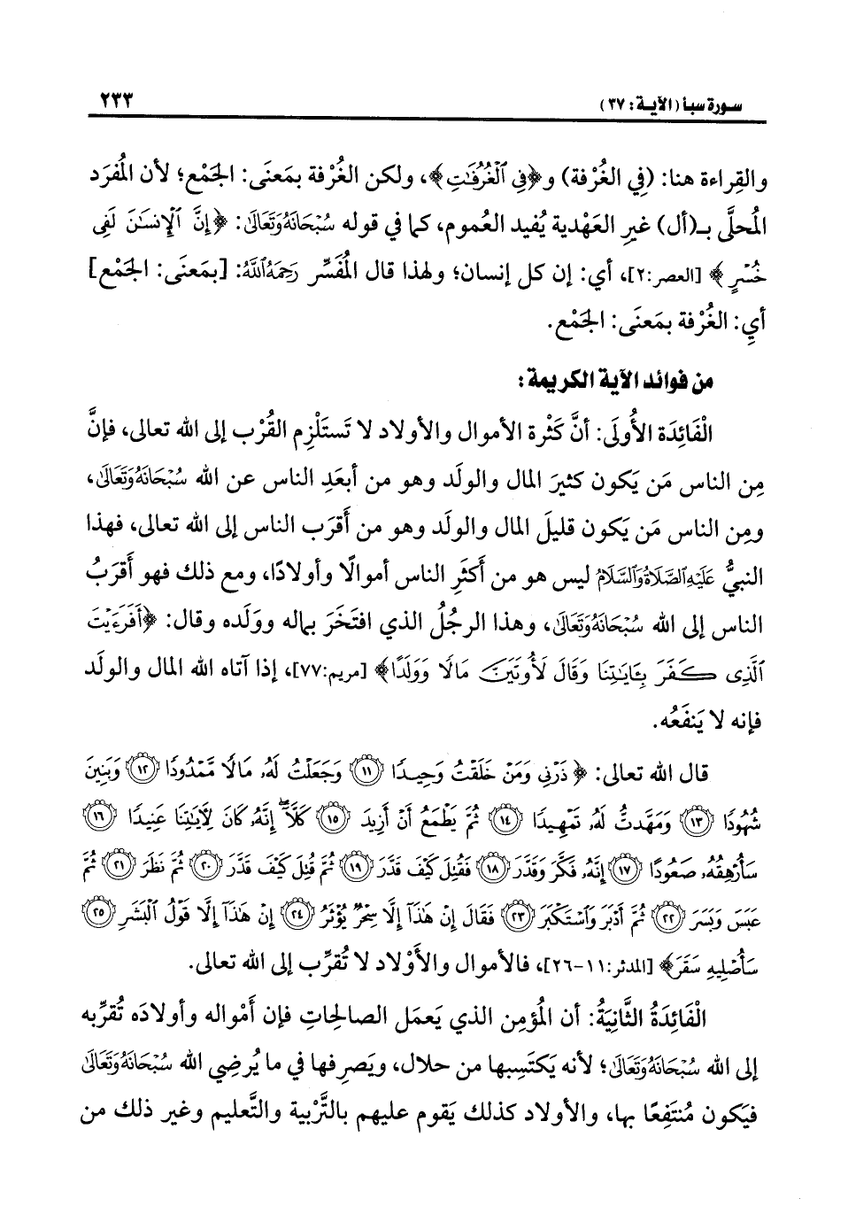 الْفَائِدَة الأُولَى: أنَّ كَثْرة الأموال والأولاد لا تَستَلْزِم القُرْب إلى الله تعالى، فإنَّ مِن الناس مَن يَكون كثيرَ المال والولَد وهو من أبعَدِ الناس عن الله سُبْحَانَهُ وَتَعَالى، ومِن الناس مَن يَكون قليلَ المال والولَد وهو من أَقرَب الناس إلى الله تعالى، فهذا النبيُّ عَلَيهَ الصَّلَاةُ وَالسَّلَامُ ليس هو من أَكثَرِ الناس أموالًا وأولادًا، ومع ذلك فهو أَقرَبُ الناس إلى الله سُبْحَانَهُ وَتَعَالَى، وهذا الرجُلُ الذي افتَخَرَ بماله ووَلَده وقال: {أَفَرَأَيْتَ الَّذِي كَفَرَ بِآيَاتِنَا وَقَالَ لَأُوتَيَنَّ مَالًا وَوَلَدًا} [مريم: ٧٧]، إذا آتاه الله المال والولَد فإنه لا يَنفَعُه.