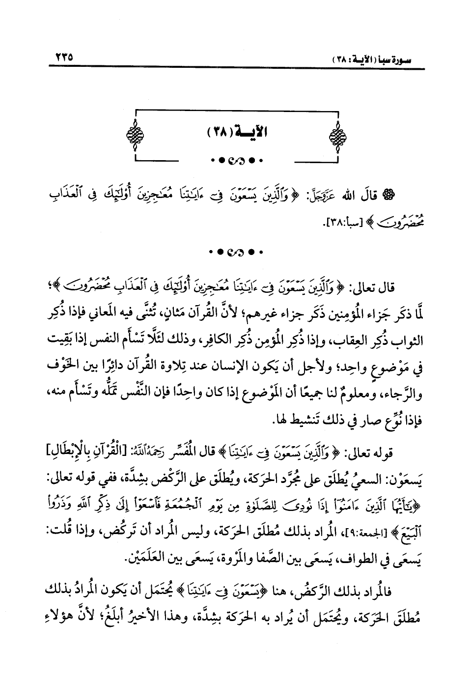 قال تعالى: {وَالَّذِينَ يَسْعَوْنَ فِي آيَاتِنَا مُعَاجِزِينَ أُولَئِكَ فِي الْعَذَابِ مُحْضَرُونَ}؛ لمَّا ذكَر جَزاء المُؤمِنين ذَكَر جزاء غيرهم؛ لأنَّ القُرآن مَثانٍ، تُثنَّى فيه المَعاني فإذا ذُكِر الثواب ذُكِر العِقاب، وإذا ذُكِر المُؤمِن ذُكِر الكافِر، وذلك لئَلَّا تَسْأَم النفس إذا بَقِيت في مَوْضوعٍ واحِد؛ ولأجل أن يَكون الإنسان عند تِلاوة القُرآن دائِرًا بين الخَوْف والرَّجاء، ومعلومٌ لنا جميعًا أن المَوْضوع إذا كان واحِدًا فإن النَّفْس تَمَلُّه وتَسْأَم منه، فإذا نُوِّع صار في ذلك تَنشيط لها.
