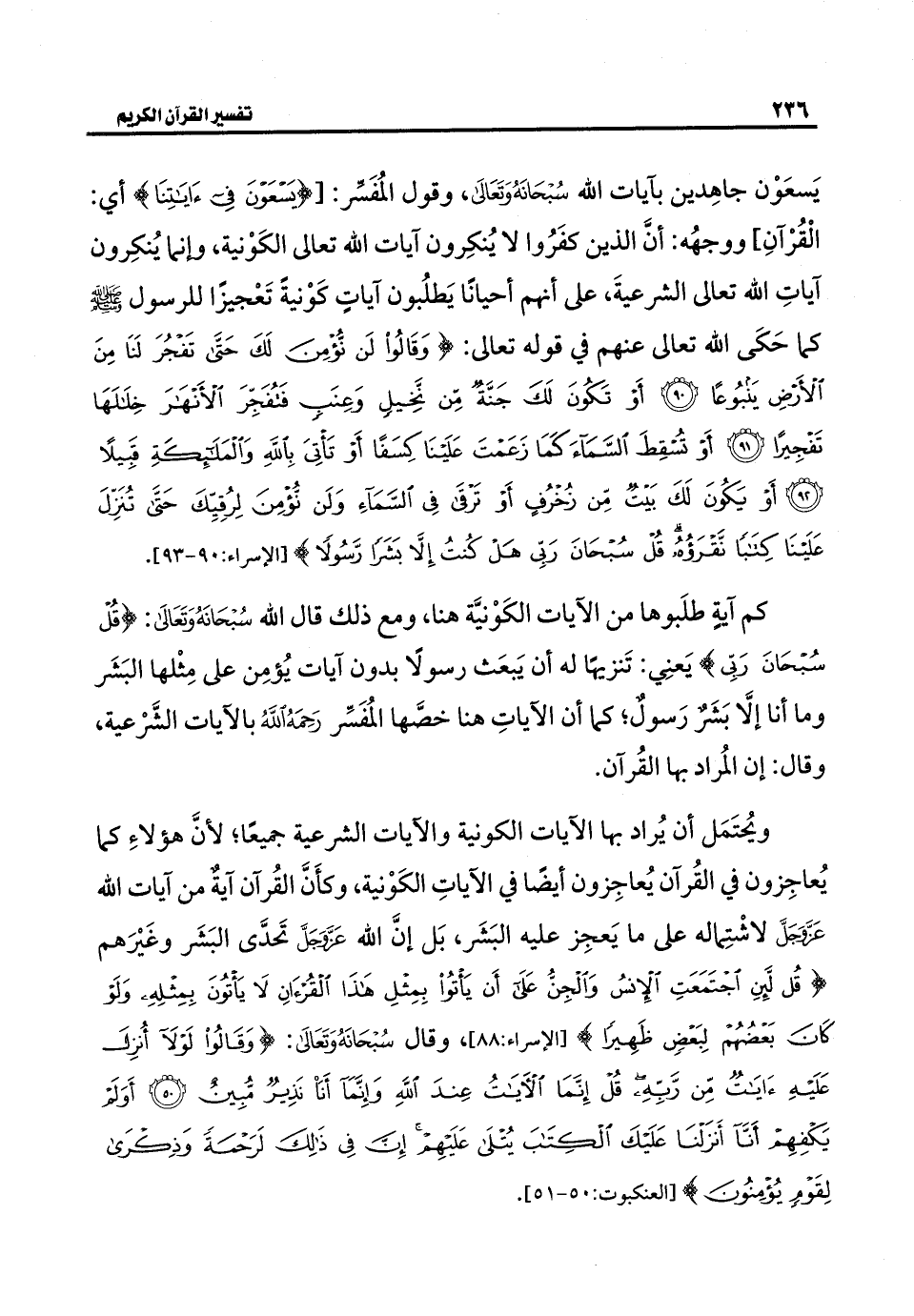 كم آيةٍ طلَبوها من الآيات الكَوْنيَّة هنا، ومع ذلك قال الله سُبْحَانَهُ وَتَعَالى: {قُلْ سُبْحَانَ رَبِّي} يَعنِي: تَنزيهًا له أن يَبعَث رسولًا بدون آيات يُؤمِن على مِثْلها البَشَر وما أنا إلَّا بَشَر رَسولٌ، كما أن الآياتِ هنا خصَّها المُفَسِّر رَحِمَهُ اللهُ بالآيات الشَّرْعية، وقال: إن المُراد بها القُرآن.