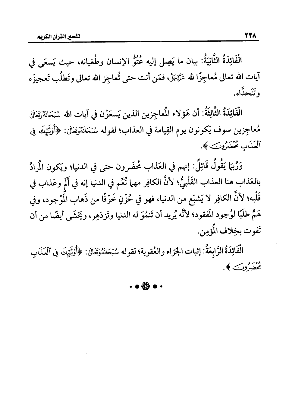 الْفَائِدَةُ الثَّالِثَةُ: أن هَؤلاء المُعاجِزين الذين يَسعَوْن في آيات الله سُبْحَانَهُ وَتَعَالى مُعاجِزين سوف يَكونون يوم القِيامة في العذاب؛ لقوله سُبْحَانَهُ وَتَعَالى: {أُولَئِكَ فِي الْعَذَابِ مُحْضَرُونَ}.