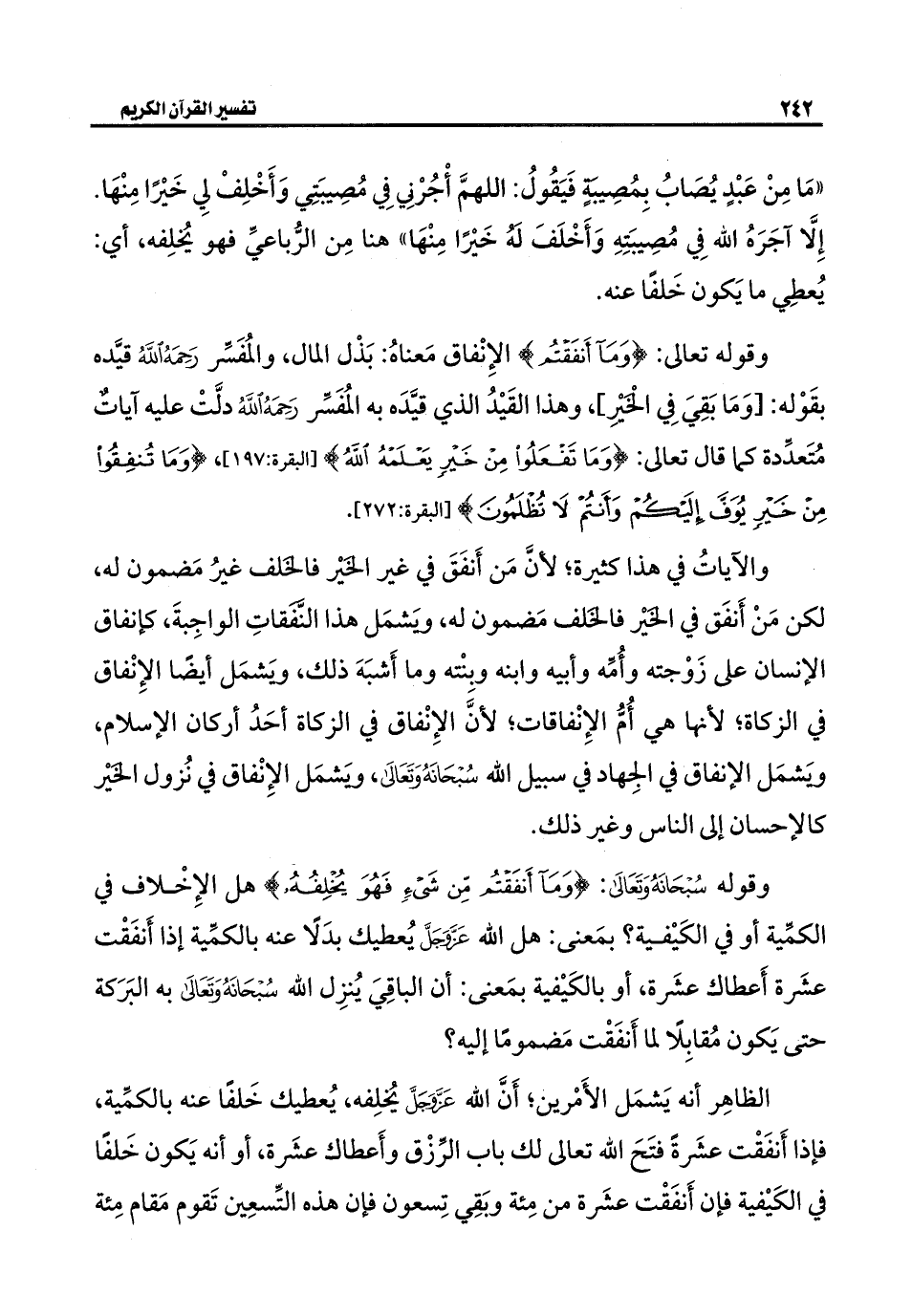والآياتُ في هذا كثيرة؛ لأنَّ مَن أَنفَقَ في غير الخَيْر فالخَلف غيرُ مَضمون له، لكن مَنْ أَنفَق في الخَيْر فالخَلف مَضمون له، وَيشمَل هذا النَّفَقاتِ الواجِبةَ، كإنفاق الإنسان على زَوْجته وأُمِّه وأبيه وابنه وبِنْته وما أَشبَهَ ذلك، وَيشمَل أيضًا الإِنْفاق في الزكاة؛ لأنها هي أُمُّ الإِنْفاقات؛ لأنَّ الإِنْفاق في الزكاة أحَدُ أركان الإسلام، وَيشمَل الإنفاق في الجِهاد في سبيل الله سُبْحَانَهُ وَتَعَالَى، وَيشمَل الإِنْفاق في نُزول الخَيْر كالإحسان إلى الناس وغير ذلك.