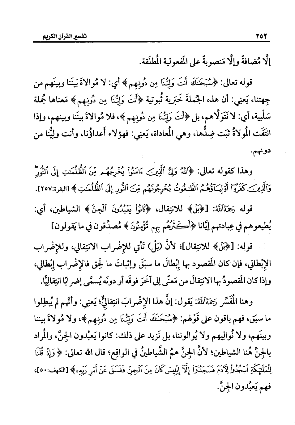 وهنا المُفَسِّر رَحِمَهُ اللهُ: يَقول: إنَّ هذا الإِضْرابَ انتِقالِيٌّ؛ يَعنِي: وأنَّهم لم يُبطِلوا ما سبَق، فهم باقون على قَوْلهم: {سُبْحَانَكَ أَنْتَ وَلِيُّنَا مِنْ دُونِهِمْ}، ولا مُولاةَ بيننا وبينَهم، ولا نُواليهم ولا يُوالوننا، بل نَزيد على ذلك: كانوا يَعبُدون الجِنَّ، والمُراد بالجِنِّ هُنا الشياطين؛ لأنَّ الجِنَّ همُ الشَّياطينُ في الواقِع؛ قال الله تعالى: {وَإِذْ قُلْنَا لِلْمَلَائِكَةِ اسْجُدُوا لِآدَمَ فَسَجَدُوا إِلَّا إِبْلِيسَ كَانَ مِنَ الْجِنِّ فَفَسَقَ عَنْ أَمْرِ رَبِّهِ} [الكهف: ٥٠]، فهم يَعبُدون الجِنَّ.