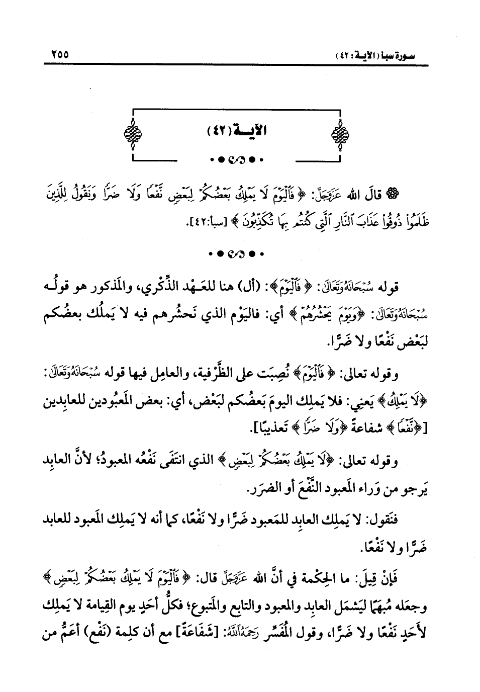 فَإنْ قِيلَ: ما الحِكْمة في أنَّ الله عَزَ وَجَلَّ قال: {فَالْيَوْمَ لَا يَمْلِكُ بَعْضُكُمْ لِبَعْضٍ} وجعَله مُبهَمًا ليَشمَل العابِد والمعبود والتابع والمَتبوع؛ فكلُّ أحَدٍ يوم القِيامة لا يَملِك لأَحَدٍ نَفْعًا ولا ضَرًّا، وقول المُفَسِّر رَحِمَهُ اللهُ: [شَفَاعَةً] مع أن كلِمة (نَفْع) أعَمُّ من