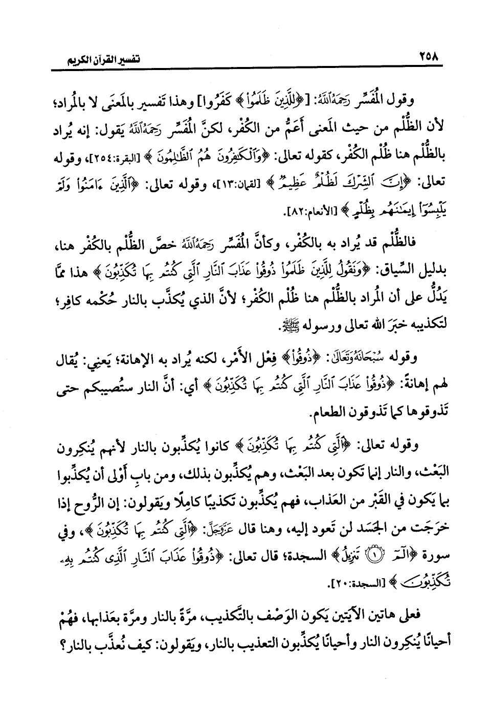 فالظُّلْم قد يُراد به بالكُفْر، وكأنَّ المُفَسِّر رَحِمَهُ اللهُ خصَّ الظُّلْم بالكُفْر هنا، بدليل السِّياق: {وَنَقُولُ لِلَّذِينَ ظَلَمُوا ذُوقُوا عَذَابَ النَّارِ الَّتِي كُنْتُمْ بِهَا تُكَذِّبُونَ} هذا ممَّا يَدُلُّ على أن المُراد بالظُّلْم هنا ظُلْم الكُفْر؛ لأنَّ الذي يُكذَّب بالنار حُكْمه كافِر؛ لتكذيبه خبَرَ الله تعالى ورسوله - صلى الله عليه وسلم -.