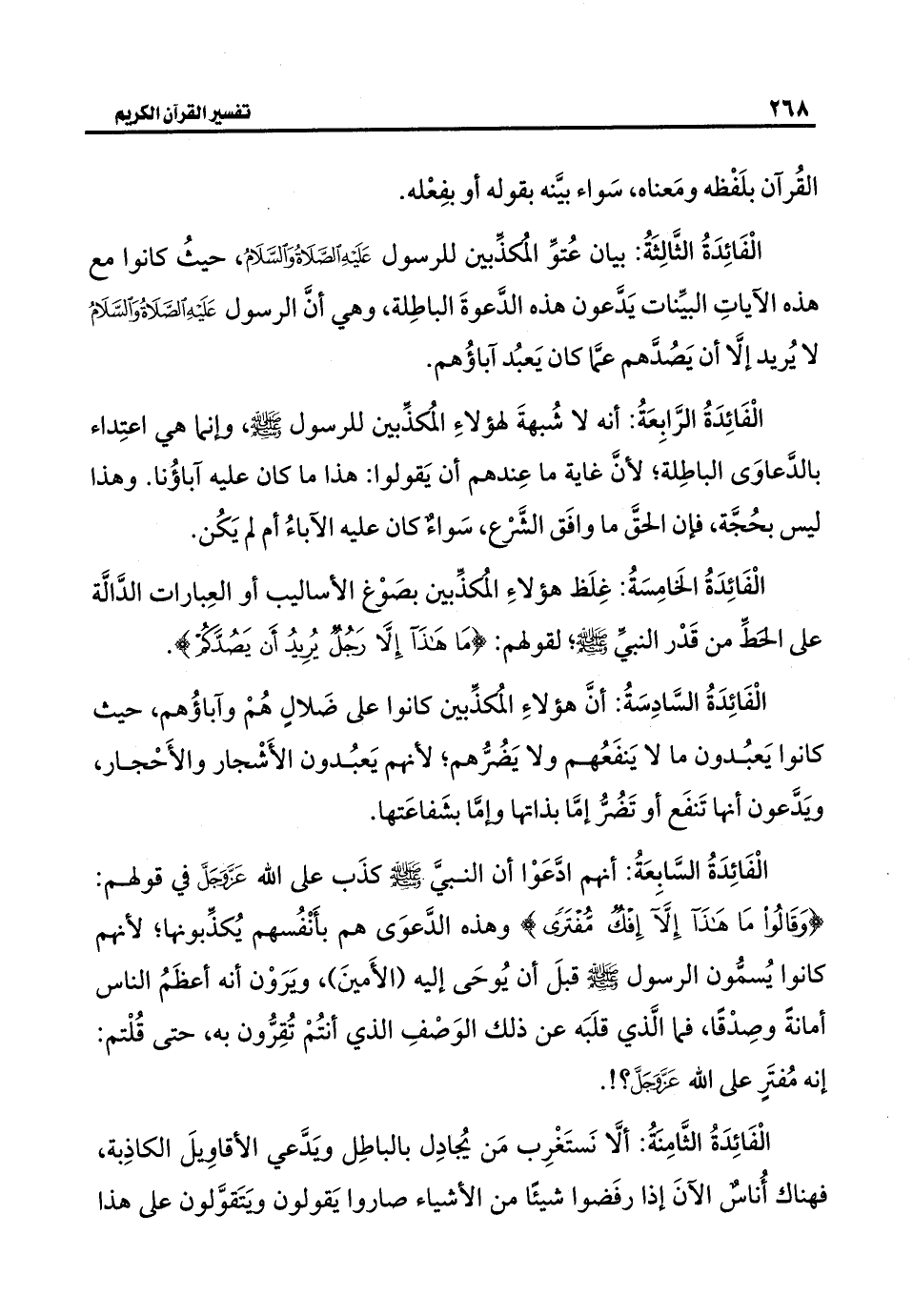 الْفَائِدَةُ الرَّابِعَةُ: أنه لا شُبهةَ لهؤلاءِ المُكذِّبين للرسول - صلى الله عليه وسلم -، وإنما هي اعتِداء بالدَّعاوَى الباطِلة؛ لأنَّ غاية ما عِندهم أن يَقولوا: هذا ما كان عليه آباؤُنا. وهذا ليس بحُجَّة، فإن الحقَّ ما وافَق الشَّرْع، سَواءٌ كان عليه الآباءُ أم لم يَكُن.