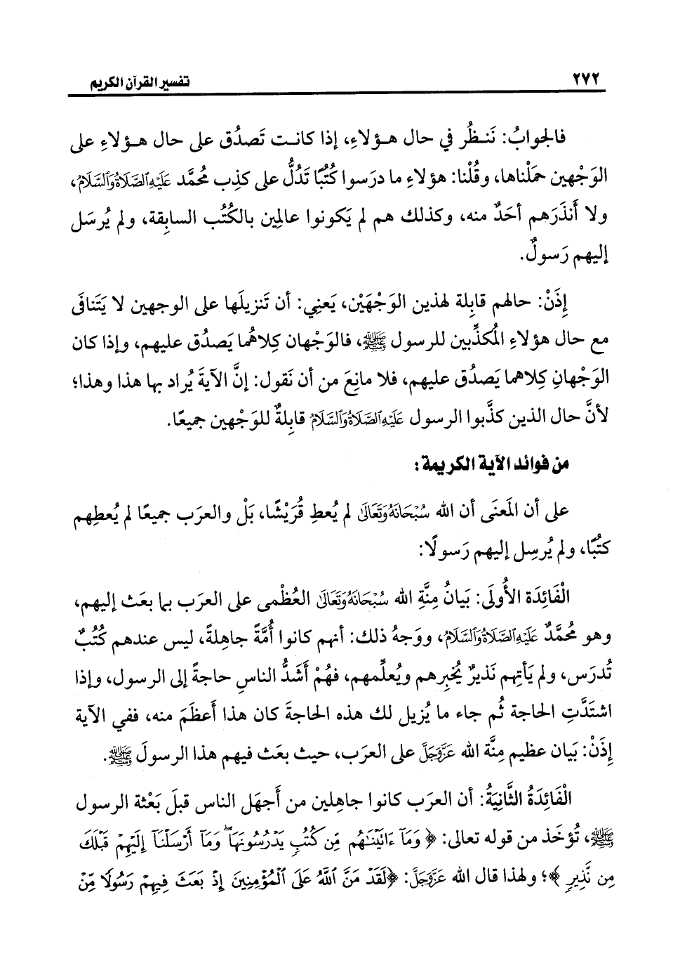 الْفَائِدَةُ الثَّانِيَةُ: أن العرَب كانوا جاهِلين من أَجهَل الناس قبلَ بَعْثة الرسول - صلى الله عليه وسلم -، تُؤخَذ من قوله تعالى: {وَمَا آتَيْنَاهُمْ مِنْ كُتُبٍ يَدْرُسُونَهَا وَمَا أَرْسَلْنَا إِلَيْهِمْ قَبْلَكَ مِنْ نَذِيرٍ}؛ ولهذا قال الله عَزَّ وَجَلَّ: {لَقَدْ مَنَّ اللَّهُ عَلَى الْمُؤْمِنِينَ إِذْ بَعَثَ فِيهِمْ رَسُولًا مِنْ
