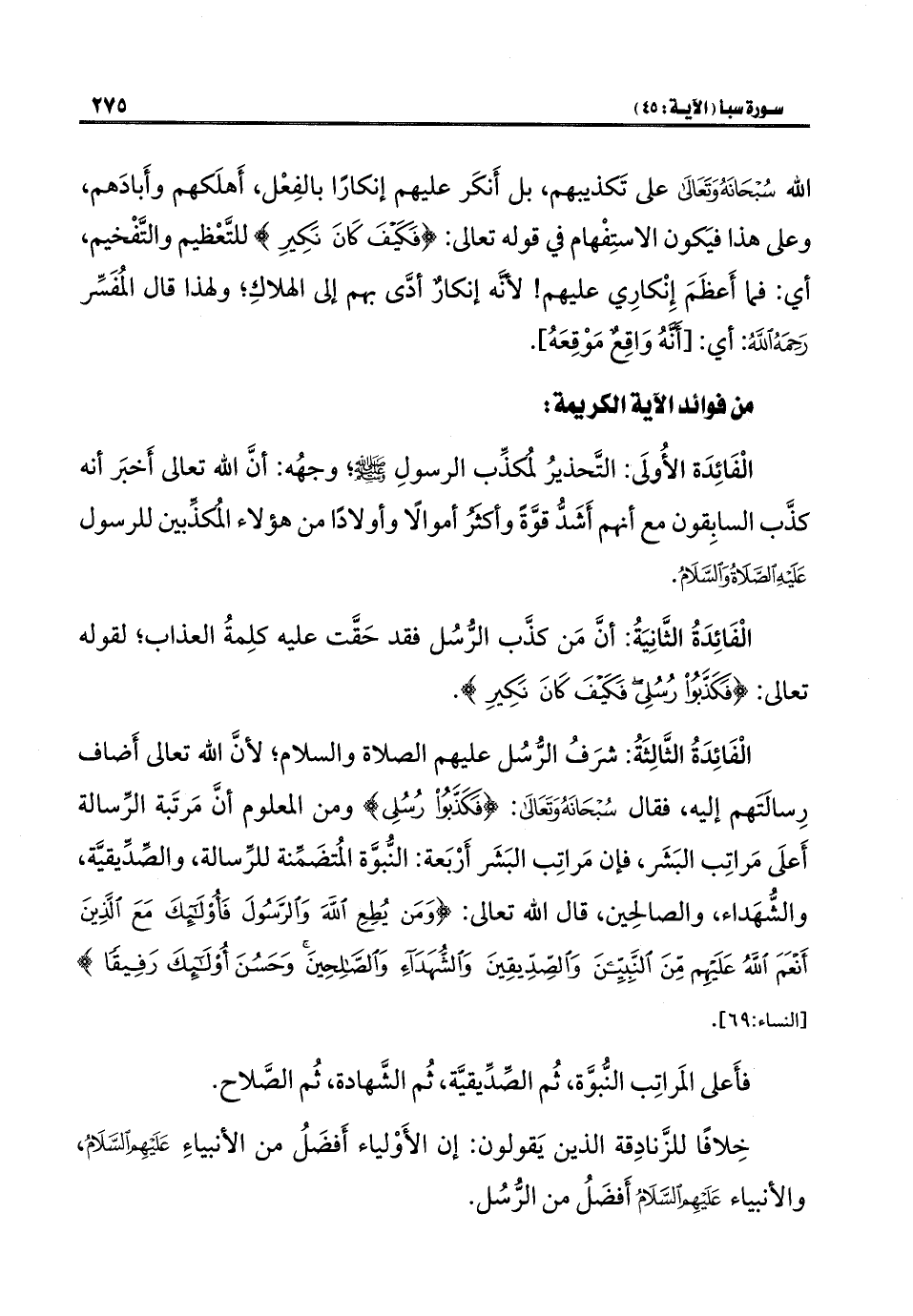 الْفَائِدَةُ الثَّالِثَةُ: شرَفُ الرُّسُل عليهم الصلاة والسلام؛ لأنَّ الله تعالى أَضاف رِسالَتَهم إليه، فقال سُبْحَانَهُ وَتَعَالَى: {فَكَذَّبُوا رُسُلِي} ومن المعلوم أنَّ مَرتَبة الرِّسالة أَعلَى مَراتِب البَشَر، فإن مَراتِب البَشَر أَرْبَعة: النُّبوَّة المُتضَمِّنة للرِّسالة، والصِّدِّيقيَّة، والشُّهَداء، والصالحِين، قال الله تعالى: {وَمَنْ يُطِعِ اللَّهَ وَالرَّسُولَ فَأُولَئِكَ مَعَ الَّذِينَ أَنْعَمَ اللَّهُ عَلَيْهِمْ مِنَ النَّبِيِّينَ وَالصِّدِّيقِينَ وَالشُّهَدَاءِ وَالصَّالِحِينَ وَحَسُنَ أُولَئِكَ رَفِيقًا} [النساء: ٦٩].