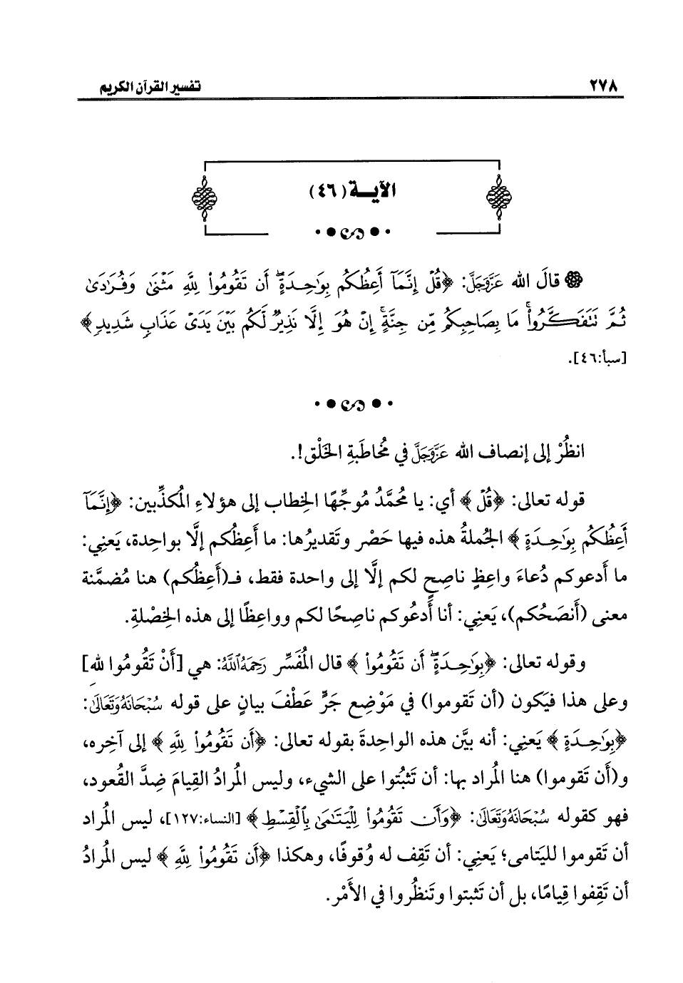 وقوله تعالى: {بِوَاحِدَةٍ أَنْ تَقُومُوا} قال المُفَسِّر رَحِمَهُ اللهُ: هي [أَنْ تَقُومُوا لله] وعلى هذا فيَكون (أن تَقوموا) في مَوْضِع جَرٍّ عَطْفَ بيانٍ على قوله سُبْحَانَهُ وَتَعَالَىَ: {بِوَاحِدَةٍ} يَعنِي: أنه بيَّن هذه الواحِدةَ بقوله تعالى: {أَنْ تَقُومُوا لِلَّهِ} إلى آخِره، و (أَن تَقوموا) هنا المُراد بها: أن تَثبُتوا على الشيء، وليس المُرادُ القِيامَ ضِدَّ القُعود، فهو كقوله سُبْحَانَهُ وَتَعَالَى: {وَأَنْ تَقُومُوا لِلْيَتَامَى بِالْقِسْطِ} [النساء: ١٢٧]، ليس المُراد أن تَقوموا لليَتامى؛ يَعنِي: أن تَقِف له وُقوفًا، وهكذا {أَنْ تَقُومُوا لِلَّهِ} ليس المُرادُ أن تَقِفوا قِيامًا، بل أن تَثبتوا وتَنظُروا في الأَمْر.