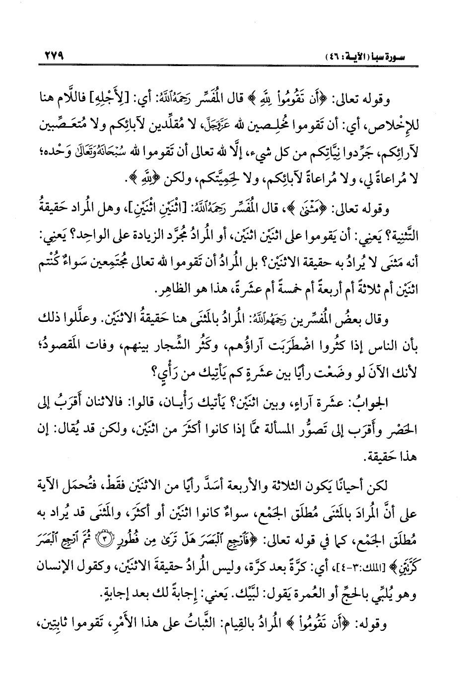 وقوله تعالى: {مَثْنَى}، قال المُفَسِّر رَحِمَهُ اللهُ: [اثْنَيْنِ اثْنَيْنِ]، وهل المُراد حَقيقةُ التَّثنِية؟ يَعنِي: أن يَقوموا على اثنَيْن اثنَيْن، أو المُرادُ مجُرَّد الزيادة على الواحِد؟ يَعنِي: أنه مَثنَى لا يُرادُ به حقيقة الاثنَيْن؟ بل المُرادُ أن تَقوموا لله تعالى مجُتَمِعين سَواءٌ كُنْتم اثنَيْن أم ثلاثةً أم أربعةً أم خمسةً أم عشَرةً، هذا هو الظاهِر.
