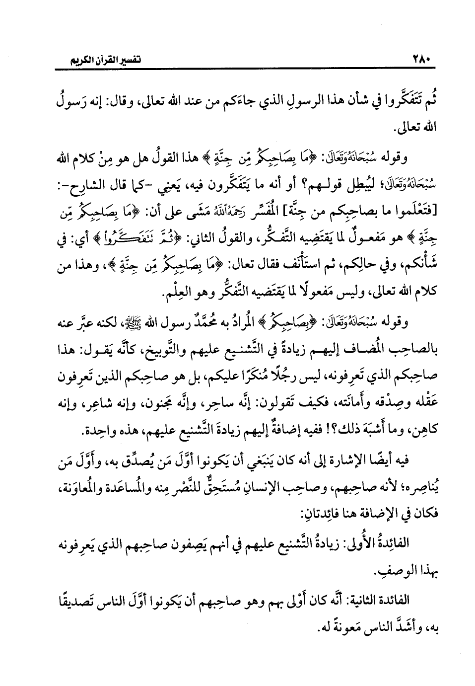 وقوله سُبْحَانَهُ وَتَعَالَى: {مَا بِصَاحِبِكُمْ مِنْ جِنَّةٍ} هذا القولُ هل هو مِنْ كلام الله سُبْحَانَهُ وَتَعَالَى؛ ليُبطِل قولهم؟ أو أنه ما يَتَفَكَّرون فيه، يَعنِي -كما قال الشارِح-: [فتَعْلَموا ما بصاحِبِكم من جِنَّة] المُفَسِّر رَحِمَهُ اللهُ مَشَى على أن: {مَا بِصَاحِبِكُمْ مِنْ جِنَّةٍ} هو مَفعولٌ لما يَقتَضِيه التَّفكُّر، والقولُ الثاني: {ثُمَّ تَتَفَكَّرُوا} أي: في شَأْنكم، وفي حالِكم، ثم استَأْنَف فقال تعال: {مَا بِصَاحِبِكُمْ مِنْ جِنَّةٍ}، وهذا من كلام الله تعالى، وليس مَفعولًا لما يَقتَضيه التَّفكُّر وهو العِلْم.