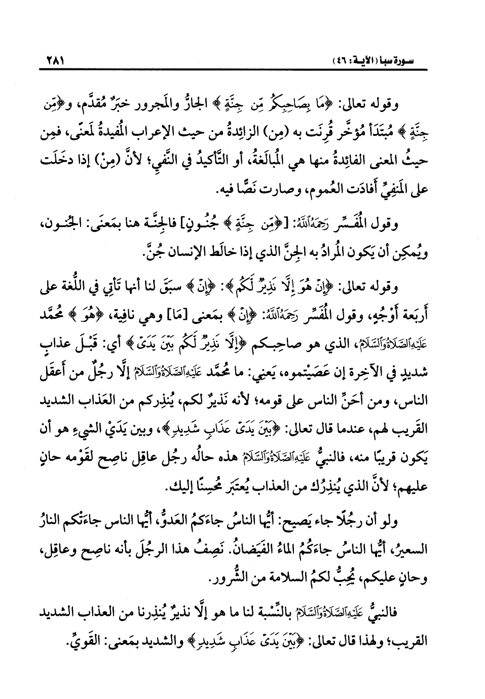 وقوله تعالى: {إِنْ هُوَ إِلَّا نَذِيرٌ لَكُمْ}: {إِنْ} سبَقَ لنا أنها تَأتِي في اللُّغة على أَربَعة أَوْجُهٍ، وقول المُفَسِّر رَحِمَهُ اللهُ: {إِنْ} بمَعنى [مَا] وهي نافِية، {هُوَ} محُمَّد عَلَيْهِ الصَلَاةُ وَالسَّلَامُ، الذي هو صاحِبكم {إِلَّا نَذِيرٌ لَكُمْ بَيْنَ يَدَيْ} أي: قَبْلَ عذابٍ شديدٍ في الآخِرة إن عَصَيْتموه، يَعنِي: ما محُمَّد عَلَيْهِ الصَّلَاةُ وَالسَّلَامُ إلَّا رجُلٌ من أَعقَل الناس، ومن أحَنِّ الناس على قومه؛ لأنه نَذيرٌ لكم، يُنذِركم من العَذاب الشديد القَريب لهم، عندما قال تعالى: {بَيْنَ يَدَيْ عَذَابٍ شَدِيدٍ}، وبين يَدَيْ الشيءِ هو أن يَكون قريبًا منه، فالنبيُّ عَلَيْهِ الصَلَاةُ وَالسَّلَامُ هذه حالُه رجُل عاقِل ناصِح لقَوْمه حانٍ عليهم؛ لأنَّ الذي يُنذِرُك من العذاب يُعتَبَر محُسِنًا إليك.