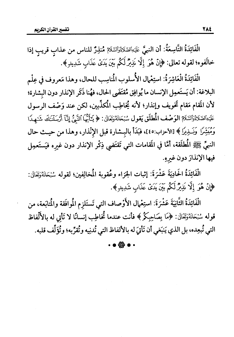 الْفَائِدَةُ التَّاسِعَةُ: أن النبيَّ عَلَيْهِ الصَّلَاةُ وَالسَّلَامُ مُنذِرٌ للناس من عذابٍ قريبٍ إذا خالَفوه؛ لقوله تعالى: {إِنْ هُوَ إِلَّا نَذِيرٌ لَكُمْ بَيْنَ يَدَيْ عَذَابٍ شَدِيدٍ}.