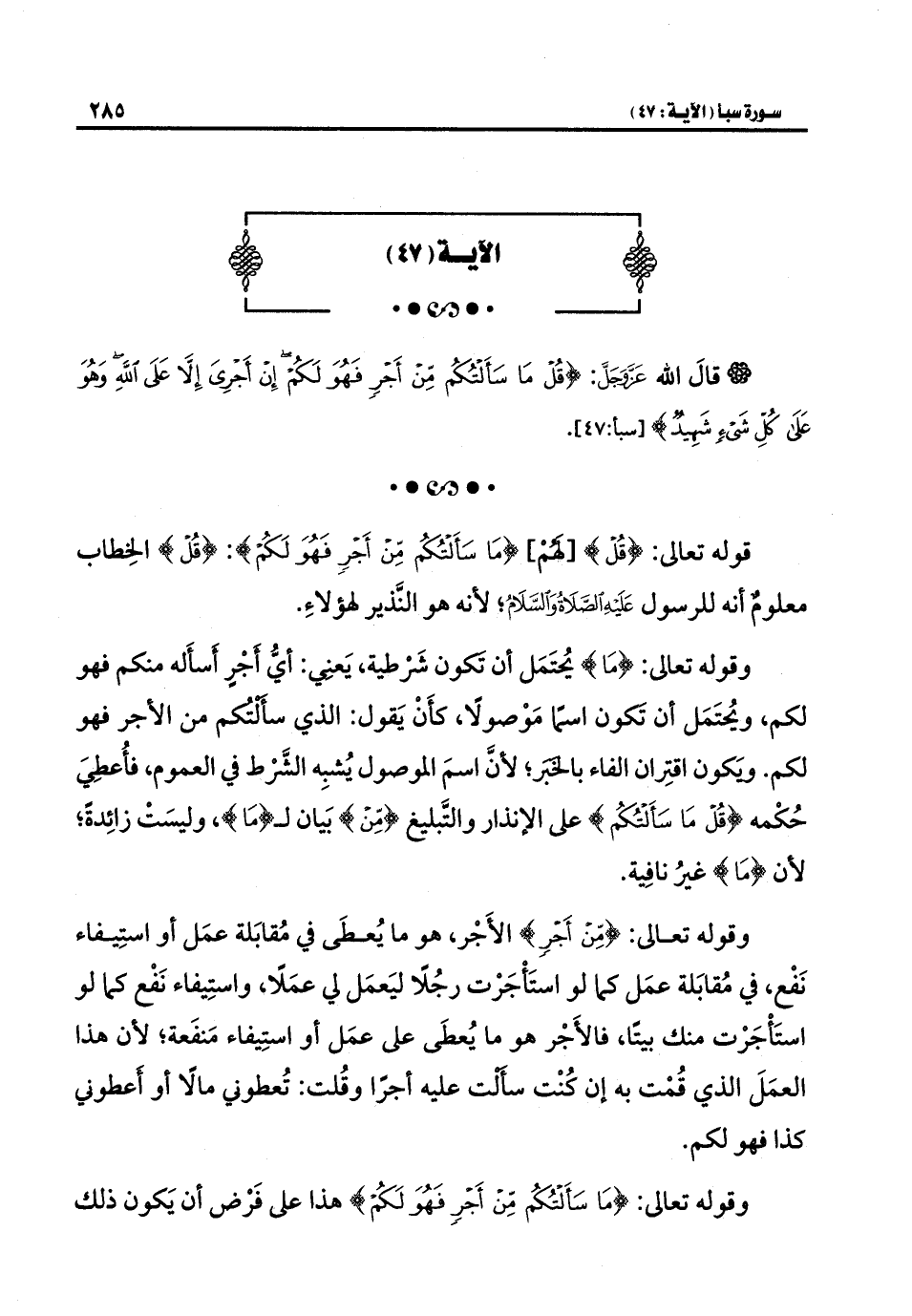 وقوله تعالى: {مَا} يُحتَمَل أن تَكون شَرْطية، يَعنِي: أيُّ أجْرٍ أَسأَله منكم فهو لكم، ويُحتَمَل أن تَكون اسمًا مَوْصولًا، كأنْ يَقول: الذي سأَلْتُكم من الأجر فهو لكم. وَيكون اقتِران الفاء بالخَبَر؛ لأنَّ اسمَ الموصول يُشبِه الشَّرْط في العموم، فأُعطِيَ حُكْمه {قُلْ مَا سَأَلْتُكُمْ} على الإنذار والتَّبليغ {مِنْ} بَيان لـ {مَا}، وليسَتْ زائِدةً؛ لأن {مَا} غيرُ نافِية.