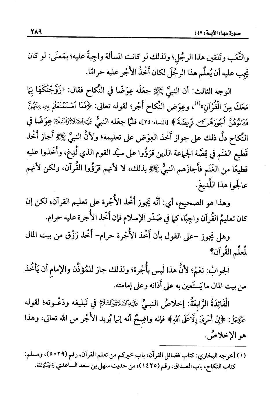 الْفَائِدَةُ الرَّابِعَةُ: إخلاصُ النبيِّ عَلَيْهِ الصَّلَاةُ وَالسَّلَامُ في تَبليغه ودَعْوته؛ لقوله عَزَّ وَجَلَّ: {إِنْ أَجْرِيَ إِلَّا عَلَى اللَّهِ} فإنه واضِحٌ أنه إنما يُريد الأَجْر من الله تعالى، وهذا هو الإخلاصُ.
