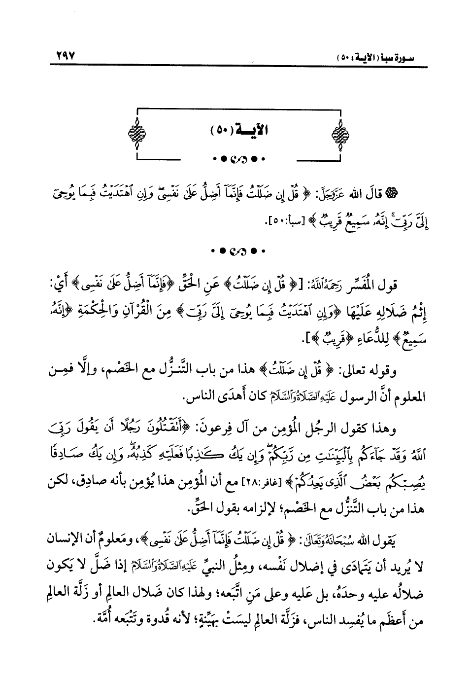 قول المُفَسِّر رَحِمَهُ الله: [{قُلْ إِنْ ضَلَلْتُ} عَنِ الْحَقِّ {فَإِنَّمَا أَضِلُّ عَلَى نَفْسِي} أَيْ: إِثْمُ ضَلَالِهِ عَلَيْهَا {وَإِنِ اهْتَدَيْتُ فَبِمَا يُوحِي إِلَيَّ رَبِّي} مِنَ الْقُرْآنِ وَالحكْمَةِ {إِنَّهُ سَمِيعٌ} لِلدُّعَاءِ {قَرِيبٌ}].