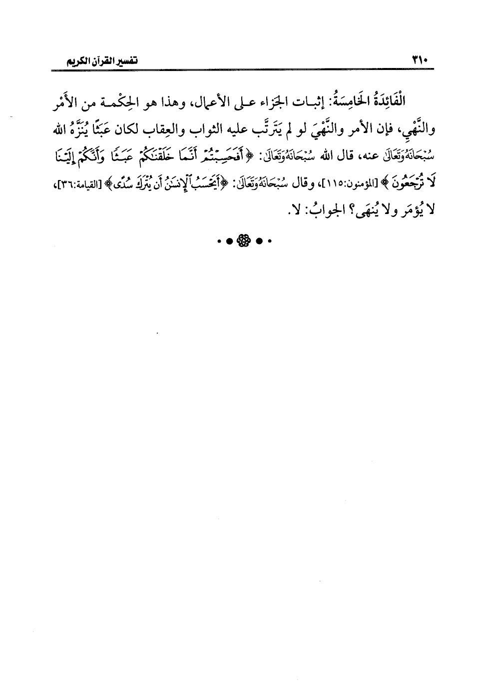 الْفَائِدَةُ الخَامِسَةُ: إثبات الجزاء على الأعمال، وهذا هو الحِكْمة من الأَمْر والنَّهْيِ، فإن الأمر والنَّهْيَ لو لم يَتَرتَّب عليه الثواب والعِقاب لكان عَبَثًا يُنَزَّهُ الله - سبحانه وتعالى - عنه، قال الله - سبحانه وتعالى -: {أَفَحَسِبْتُمْ أَنَّمَا خَلَقْنَاكُمْ عَبَثًا وَأَنَّكُمْ إِلَيْنَا لَا تُرْجَعُونَ (١١٥)} [المؤمنون: ١١٥]، وقال - سبحانه وتعالى -: {أَيَحْسَبُ الْإِنْسَانُ أَنْ يُتْرَكَ سُدًى (٣٦)} [القيامة: ٣٦]، لا يُؤمَر ولا يُنهى؟ الجوابُ: لا.