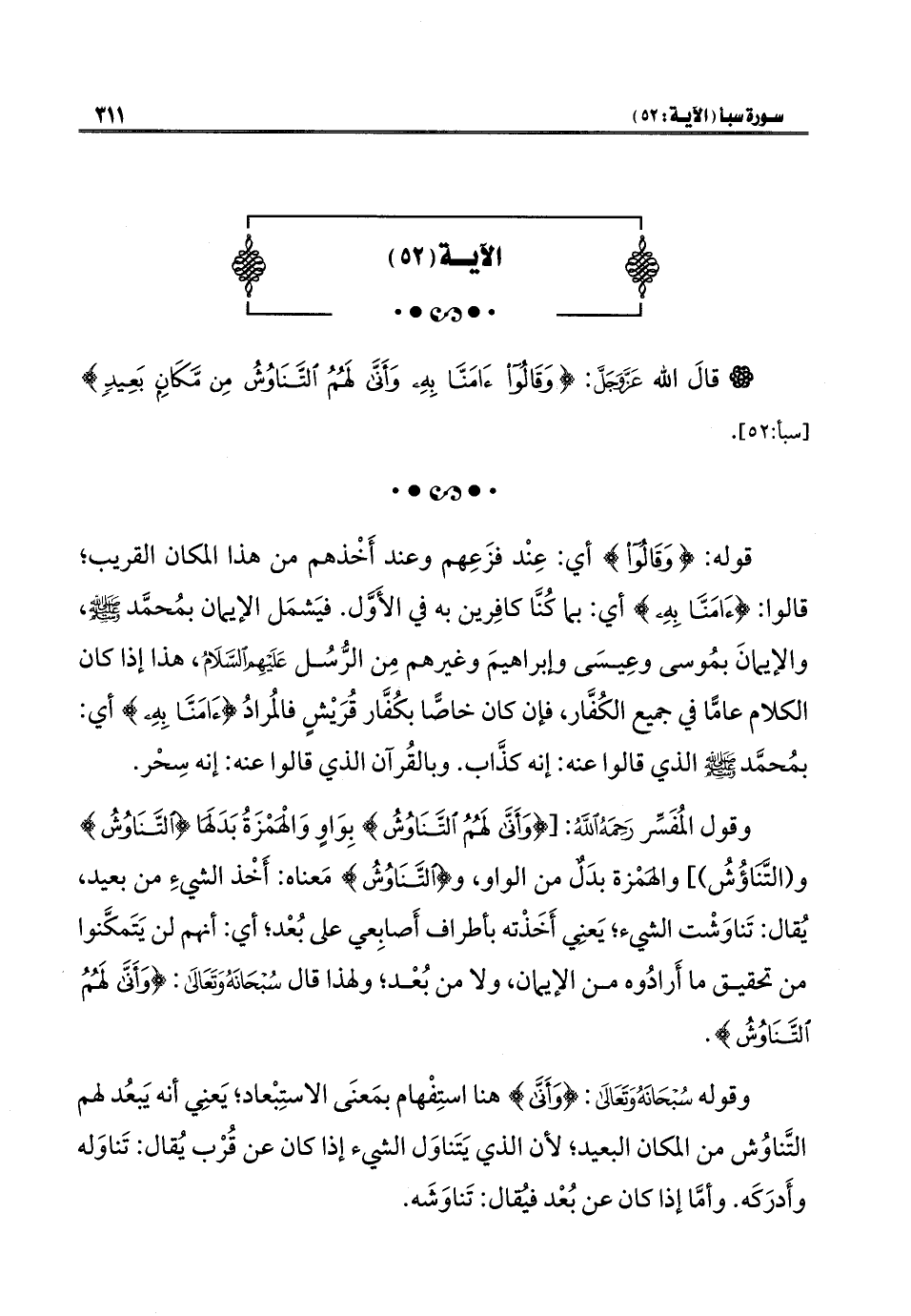 وقول المُفَسِّر -رحمه الله -: [{وَأَنَّى لَهُمُ التَّنَاوُشُ} بِوَاوٍ وَالهمزَةُ بَدلَها {التَّنَاوُشُ} و (التّنَاؤُشُ)] والهمزة بدَلٌ من الواو، و {التَّنَاوُشُ} مَعناه: أَخْذ الشيءِ من بعيد، يُقال: تَناوَشْت الشيء، يَعنِي أَخَذْته بأطراف أَصابِعي على بُعد؛ أي: أنهم لن يَتَمكَّنوا من تحقيق ما أَرادُوه من الإيمان، ولا من بُعْد؛ ولهذا قال - سبحانه وتعالى -: {وَأَنَّى لَهُمُ التَّنَاوُشُ}.