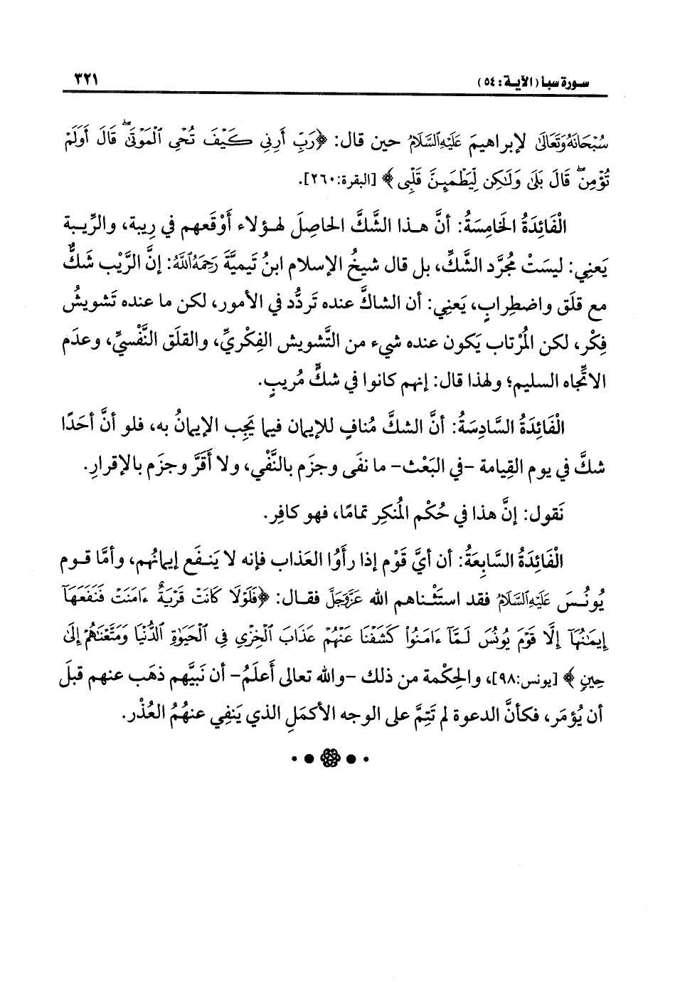 الْفَائِدَةُ الخَامِسَةُ: أنَّ هذا الشَّكَّ الحاصِلَ لهؤلاء أَوْقَعهم في رِيبة، والرِّيبة يَعنِي: ليسَتْ مجُرَّد الشَّكِّ، بل قال شيخُ الإسلام ابنُ تَيميَّةَ -رحمه الله -: إنَّ الرَّيْب شَكٌّ مع قلَق واضطِرابٍ، يَعنِي: أن الشاكَّ عنده تَردُّد في الأمور، لكن ما عنده تَشويشُ فِكْر، لكن المُرتاب يَكون عنده شيء من التَّشويش الفِكْريِّ، والقلَق النَّفْسيِّ، وعدَم الاتِّجاه السليم؛ ولهذا قال: إنهم كانوا في شكٍّ مُريبٍ.