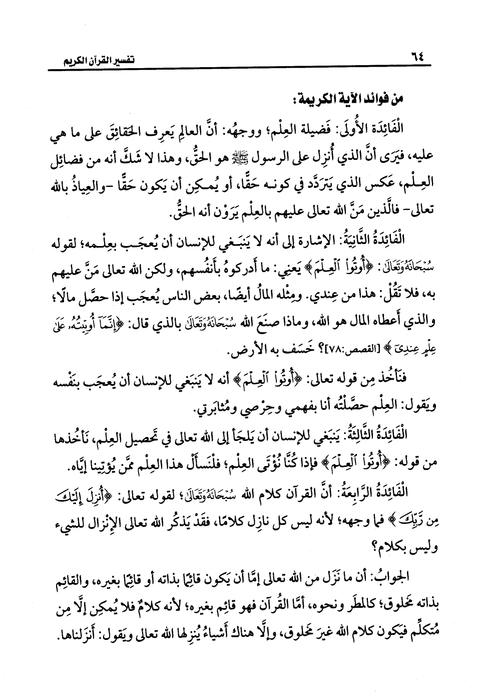 الفائِدةُ الثَّانِيَةُ: الإشارة إلى أنه لا يَنبَغي للإنسان أن يُعجَب بعِلْمه؛ لقوله سُبحَانَهُ وَتَعَالَى: {أُوتُوا الْعِلْمَ} يَعنِي: ما أَدركوهُ بأَنفُسهم، ولكن الله تعالى مَنَّ عليهم به، فلا تَقُلْ: هذا من عِندي. ومِثْله المالُ أيضًا، بعض الناس يُعجَب إذا حصَّل مالًا؛ والذي أَعطاه المال هو الله، وماذا صنَعَ الله سُبْحَانَهُ وَتَعَالى بالذي قال: {إِنَّمَا أُوتِيتُهُ عَلَى عِلْمٍ عِنْدِي} [القصص: ٧٨]؟ خَسَف به الأرض.