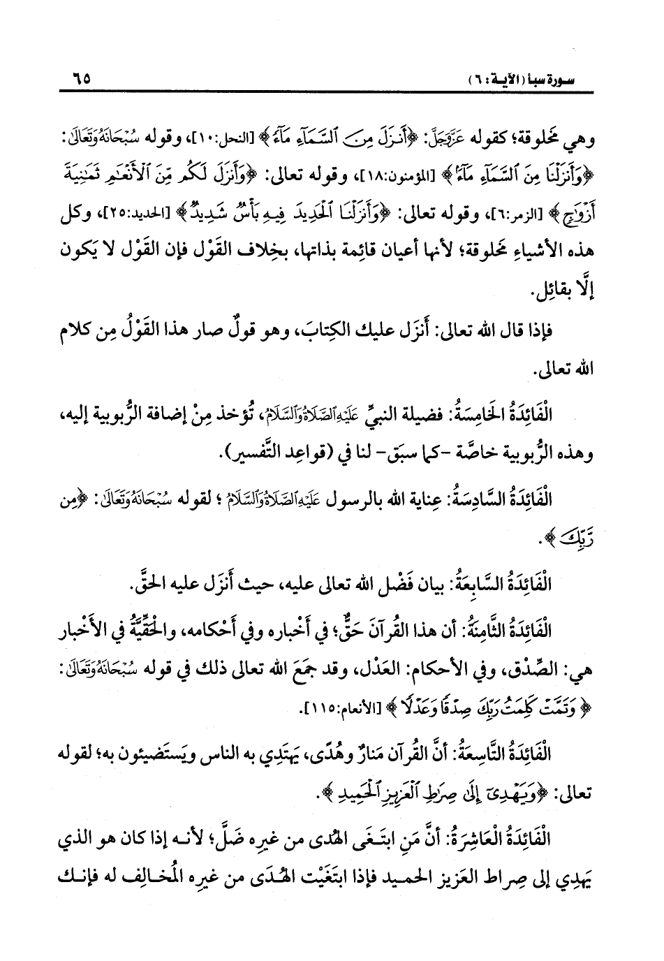 الفائِدةُ التَّاسِعَةُ: أنَّ القُرآن مَنارٌ وهُدًى، يَهتَدِي به الناس وَيستَضيئون به؛ لقوله تعالى: {وَيَهْدِي إِلَى صِرَاطِ الْعَزِيزِ الْحَمِيدِ}.