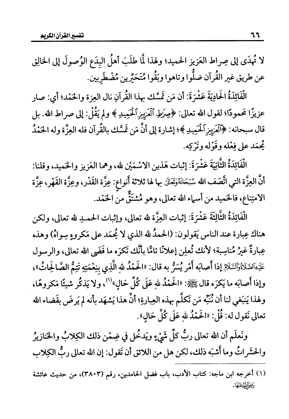 الْفَائِدَةُ الحَادِيَةَ عَشْرَةَ: أن مَن تمَسَّك بهذا القُرآنِ نال العِزة والحمْد؛ أي: صار عزيزًا مَحمودًا؛ لقول الله تعالى: {صِرَاطِ الْعَزِيزِ الْحَمِيدِ} ولم يَقُلْ: إلى صراط الله. بل قال سبحانه: {الْعَزِيزِ الْحَمِيدِ}؛ إشارة إلى أنَّ مَن تمَسَّك بالقُرآن فله العِزَّة وله الحمْدُ يُحمَد على فِعْله وقَوْله وتَرْكِه.