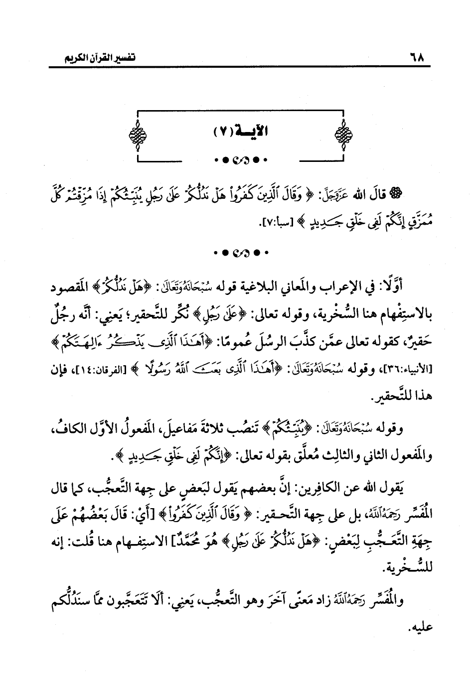 يَقول الله عن الكافِرين: إنَّ بعضهم يَقول لبَعضٍ على جِهة التَّعجُّب، كما قال المُفَسِّر رَحِمَهُ اللهُ، بل على جِهة التَّحقير: {وَقَالَ الَّذِينَ كَفَرُوا} [أَيْ: قَالَ بَعْضُهُمْ عَلَى جِهَةِ التَّعَجُّبِ لِبَعْضٍ: {هَلْ نَدُلُّكُمْ عَلَى رَجُلٍ} هُوَ مُحَمَّدٌ]، الاستِفهام هنا قُلت: إنه للسُّخْرية.
