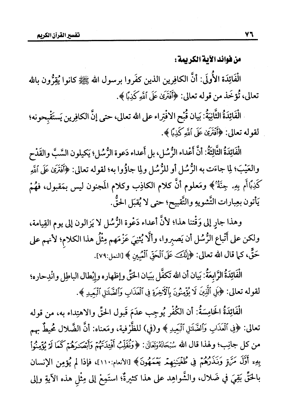 الفائِدةُ الثَّانِيَةُ: بَيان قُبْح الافْتِراء على الله تعالى، حتى إنَّ الكافِرين يَستَقْبِحونه؛ لقوله تعالى: {أَفْتَرَى عَلَى اللَّهِ كَذِبًا}.
