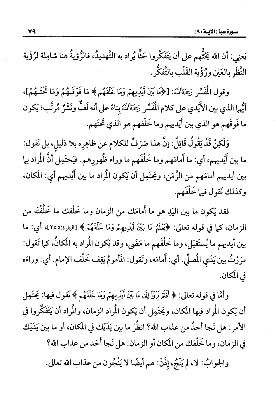 وَلَكِنْ قَدْ يَقُولُ قَائِلٌ: إنَّ هذا صَرْفٌ للكلام عن ظاهِرِه بلا دَليلٍ، بل نَقول: ما بين أَيْديهم، أي: ما أَمامَهم وما خَلْفَهم ما وراء ظُهورِهم. فيَحتَمِل أنَّ المُراد بما بين أيديهم أمامَهم من الزَّمَن، ويَحتَمِل أن يَكون المُراد ما بين أَيْديهم أيِ: المَكان، وكذلك نَقول فيما خَلْفَهم.