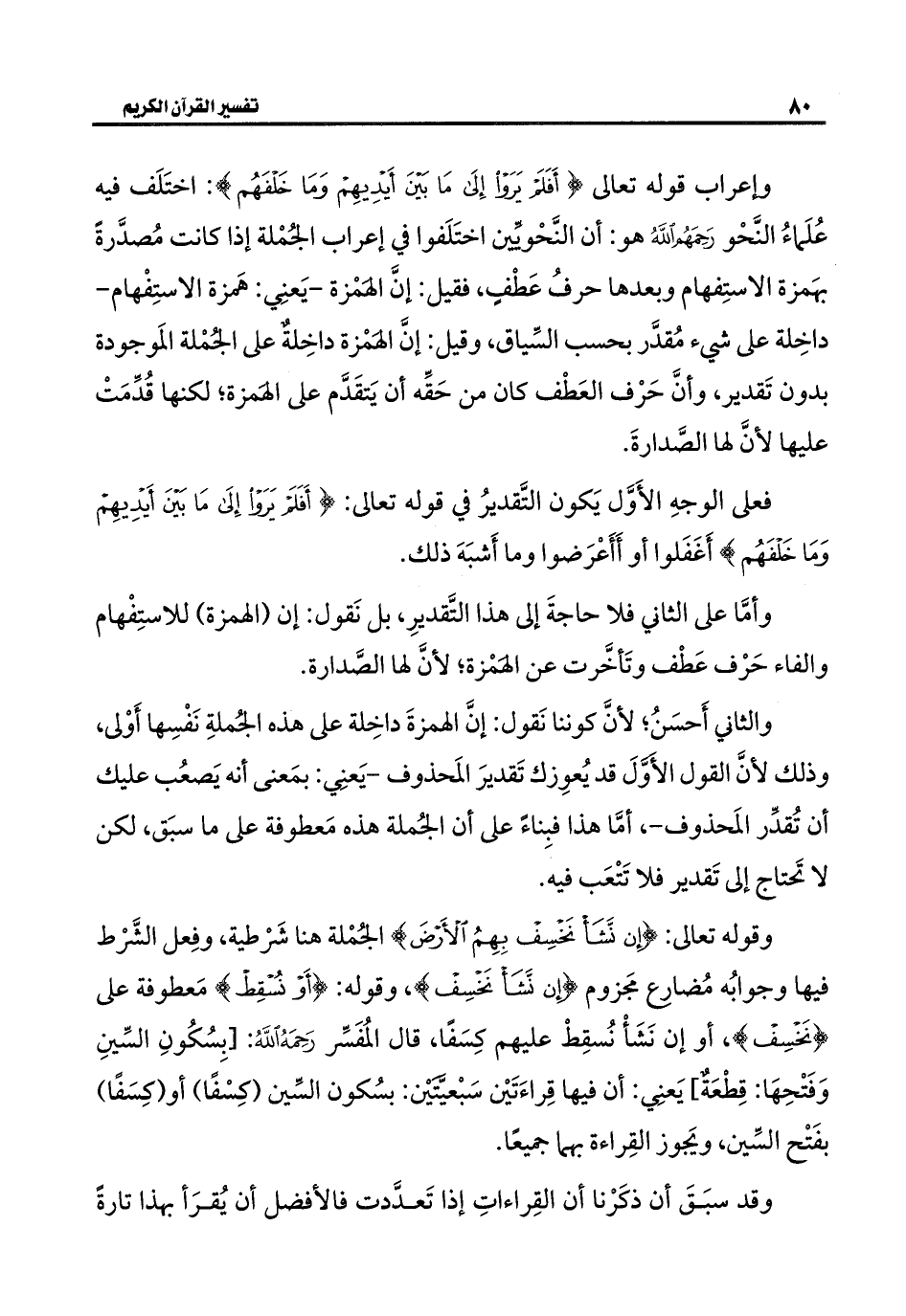 وإعراب قوله تعالى {أَفَلَمْ يَرَوْا إِلَى مَا بَيْنَ أَيْدِيهِمْ وَمَا خَلْفَهُمْ}: اختَلَف فيه عُلَماءُ النَّحْو رَحَمَهُم اللهُ هو: أن النَّحْويِّين اختَلَفوا في إعراب الجُمْلة إذا كانت مُصدَّرةً بهَمزة الاستِفهام وبعدها حرفُ عَطْفٍ، فقيل: إنَّ الهَمْزة -يَعنِي: هَمزة الاستِفْهام- داخِلة على شيء مُقدَّر بحسب السِّياق، وقيل: إنَّ الهَمْزة داخِلةٌ على الجُمْلة المَوجودة بدون تَقدير، وأنَّ حَرْف العَطْف كان من حَقِّه أن يَتقَدَّم على الهَمزة؛ لكنها قُدِّمَتْ عليها لأنَّ لها الصَّدارةَ.