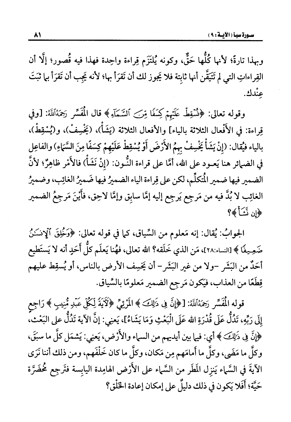 وقوله تعالى: {نُسْقِطْ عَلَيْهِمْ كِسَفًا مِنَ السَّمَاءِ} قال المُفَسِّر رَحِمَهُ اللهُ: [وفي قِراءة: في الأَفْعال الثلاثة بالياء] والأفعال الثلاثة (يَشَأْ)، (يَخْسِفْ)، و (يُسْقِطْ)، بالياء فيُقال: (إِنْ يَشَأْ يَخْسِفْ بِهِمُ الأَرْضَ أَوْ يُسْقِطْ عَلَيْهِمْ كسَفًا مِنَ السَّمَاءِ) والفاعِل في الضمائر هنا يَعود على الله، أمَّا على قراءة النُّون: (إِنْ نَشَأْ) فالأَمْر ظاهِرٌ؛ لأنَّ الضمير فيها ضمير المُتكلّم، لكن على قِراءة الياء الضميرُ فيها ضَميرُ الغائِب، وضميرُ الغائِب لا بُدَّ فيه من مَرجع يَرجِع إليه إمَّا سابِق وإمَّا لاحِق، فأَيْنَ مَرجِعُ الضمير {إِنْ نَشَأْ}؟