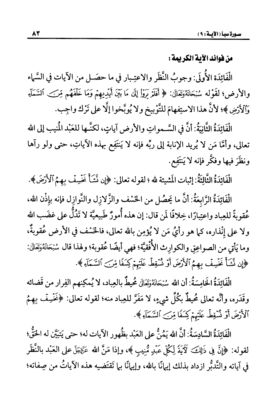 الفائِدةُ الرَّابِعَةُ: أنَّ ما يَحصُل من الخَسْف والزَّلازِل والنَّوازِل فإنه بإِذْن الله، عُقوبةً للعِباد واعتِبارًا، خِلافًا لمَن قال: إن هذه أُمورٌ طَبيعيَّة لا تَدُلُّ على غضَب الله ولا على إِنْذاره، كما هو رأيُ مَن لا يُؤمِن بالله تعالى، فالخَسْف في الأرض عُقوبةٌ، وما يَأتي من الصواعِقِ والكوارِث الأُفْقيَّة؛ فهي أيضًا عُقوبة؛ ولهذا قال سُبْحَانَهُ وَتَعَالى: {إِنْ نَشَأْ نَخْسِفْ بِهِمُ الْأَرْضَ أَوْ نُسْقِطْ عَلَيْهِمْ كِسَفًا مِنَ السَّمَاءِ}.