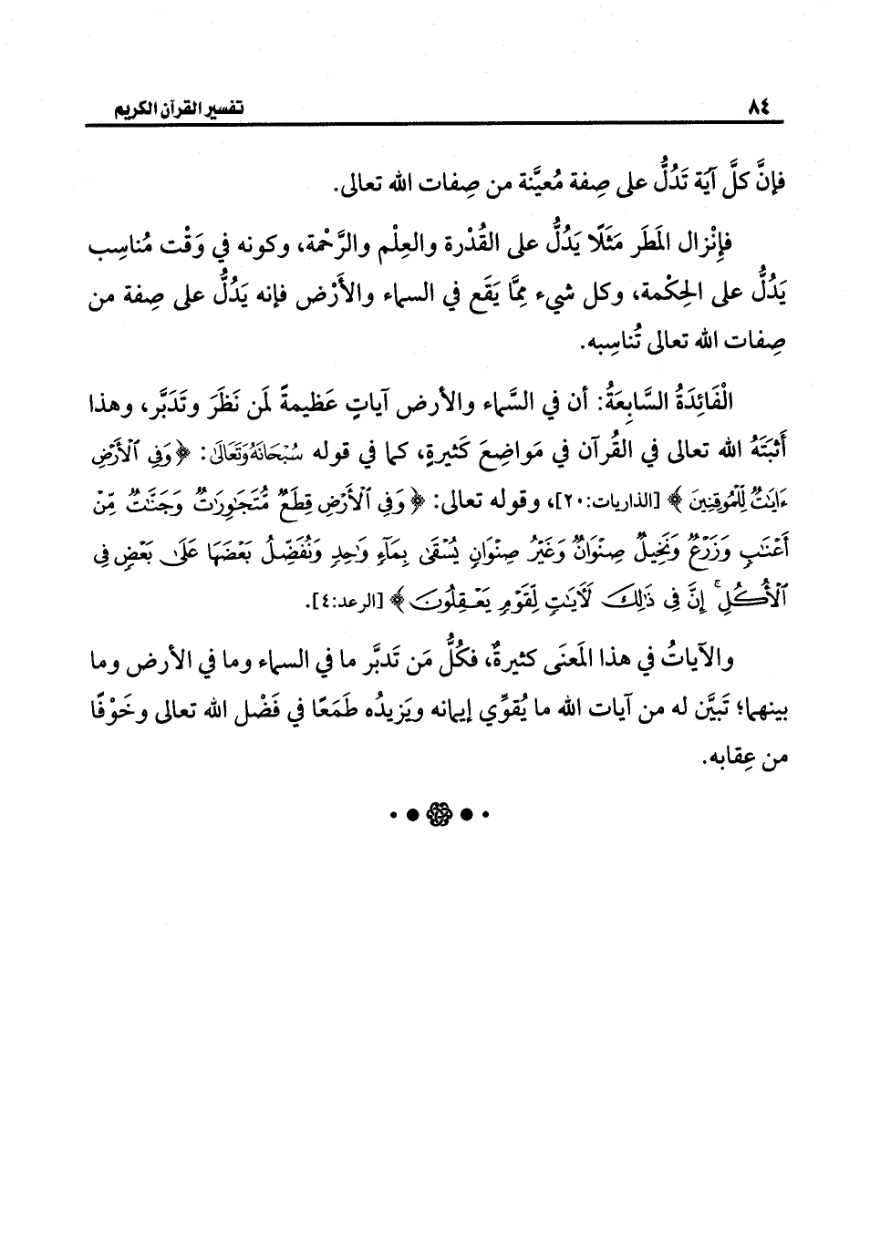 فإنْزال المَطَر مَثَلًا يَدُلُّ على القُدْرة والعِلْم والرَّحْمة، وكونه في وَقْت مُناسِب يَدُلُّ على الحِكْمة، وكل شيء مِمَّا يَقَع في السماء والأَرْض فإنه يَدُلُّ على صِفة من صِفات الله تعالى تُناسِبه.
