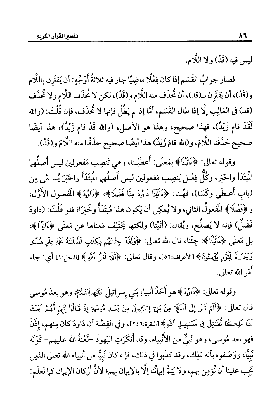 وقوله تعالى: {آتَيْنَا} بمَعنَى: أَعطَيْنا، وهي تَنصِب مَفعولين ليس أَصلُهما المُبتَدَأ والخَبر، وكُلُّ فِعْل يَنصِب مَفعولين ليس أَصلُهما المُبتَدَأَ والخَبرَ يُسمَّى مِن (بابِ أَعطَى وكَسَا)، فهُنا: {آتَيْنَا دَاوُودَ مِنَّا فَضْلًا}، {دَاوُودَ} المَفعول الأَوَّل، و {فَضْلًا} المَفعولُ الثاني، ولا يُمكِن أن يَكون هذا مُبتَدَأً وخَبَرًا؛ فلو قُلْتَ: (داودُ فَضْلٌ) فإنه لا يَصلُح، ويُقال: (أتَيْنا) ولكنها يَختَلِف مَعناها عن مَعنَى {آتَيْنَا}، بل مَعنَى {آتَيْنَا}: جِئْنا، قال الله تعالى: {وَلَقَدْ جِئْنَاهُمْ بِكِتَابٍ فَصَّلْنَاهُ عَلَى عِلْمٍ هُدًى وَرَحْمَةً لِقَوْمٍ يُؤْمِنُونَ} [الأعراف: ٥٢]، وقال تعالى: {أَتَى أَمْرُ اللَّهِ} [النحل: ١] أي: جاء أَمْر الله تعالى.