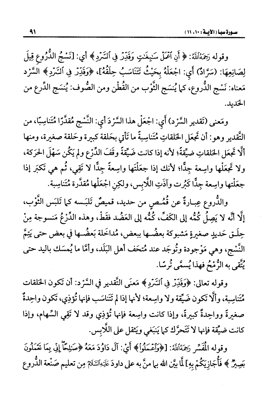 ومَعنى (تَقدير السَّرْد) أَيِ: اجْعَلْ هذا السَّرْدَ أيِ: النَّسْج مُقدَّرًا مُتَناسِبًا، من التَّقدير وهو: أن تَجعَل الحلقاتِ مُتَناسِبةً ما تَأتي بحَلقة كبيرة وحَلقة صغيرة، ومنها ألَّا تَجعَل الحلقاتِ ضيِّقةً؛ لأنه إذا كانت ضَيِّقةً وقَفَ الدِّرْع ولم يَكُن سَهْلَ الحرَكة، ولا تَجعَلْها واسِعة جِدًّا؛ لأنك إذا جعَلْتَها واسِعةً جِدًّا لا تَقِي، ثُم هي تَكبَر إذا جعَلْتها واسِعة جِدًّا كَبُرت وآذَتِ اللَّابِس، ولكِنِ اجْعَلْها مُقدَّرة مُتَناسِبة.