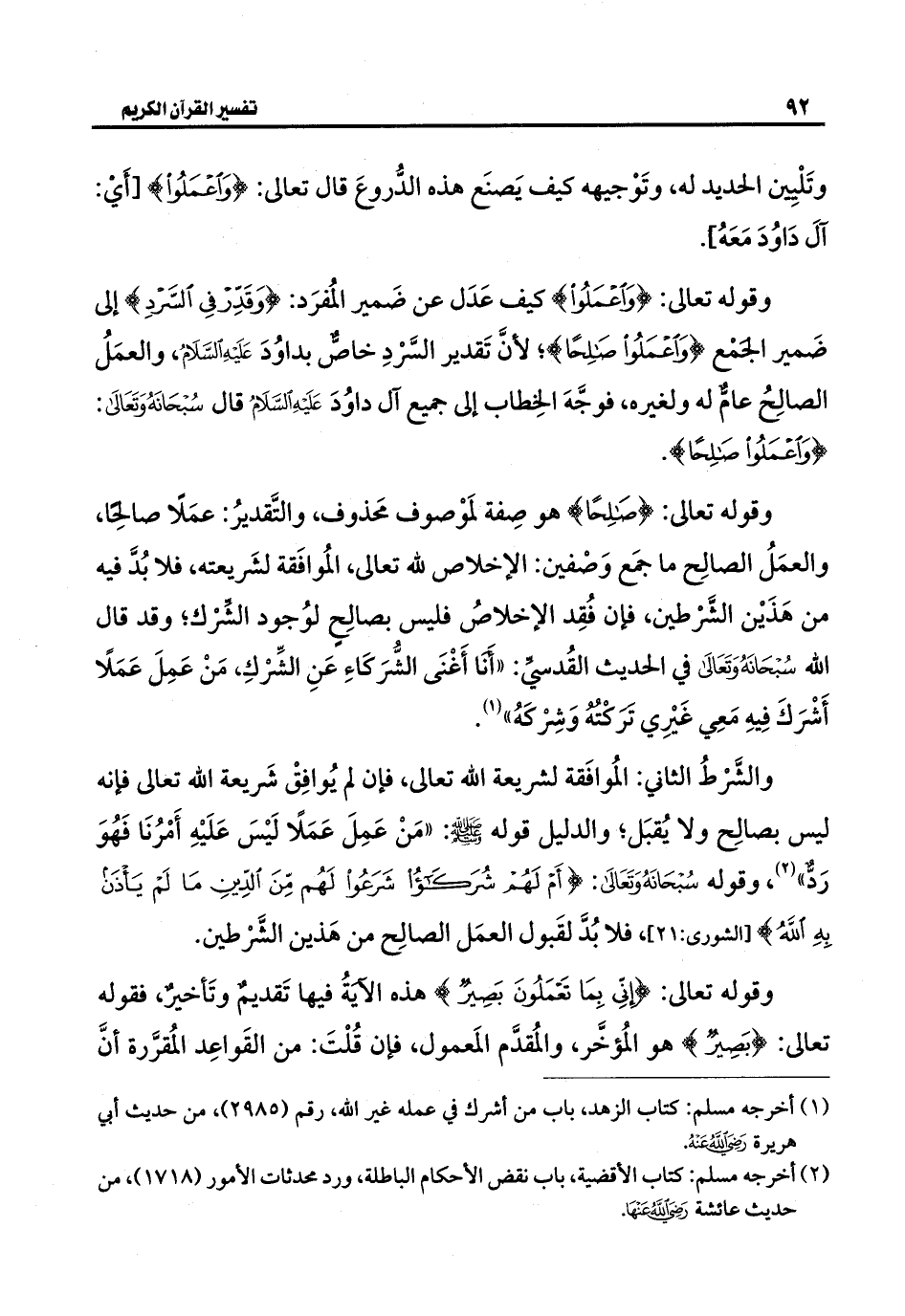 وقوله تعالى: {صَالِحًا} هو صِفة لمَوْصوف مَحذوف، والتَّقديرُ: عمَلًا صالِحًا، والعمَلُ الصالِح ما جمَع وَصْفين: الإخلاص لله تعالى، المُوافَقة لشَريعته، فلا بُدَّ فيه من هَذَيْن الشَّرْطين، فإن فُقِد الإخلاصُ فليس بصالِحٍ لوُجود الشِّرْك؛ وقد قال الله سُبْحَانَهُ وَتَعَالى في الحديث القُدسيِّ: "أنَا أَغْنَى الشُّرَكَاءِ عَنِ الشِّرْكِ، مَنْ عَمِلَ عَمَلًا أَشْرَكَ فِيهِ مَعِي غَيْرِي ترَكته وَشِرْكَهُ" (¬١).