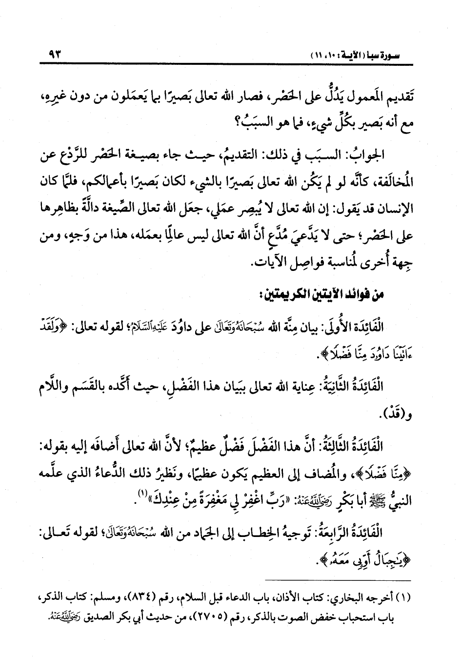 الفائِدةُ الأُوْلَى: بيان مِنَّة الله سُبْحَانَهُ وَتَعَالَى على داوُدَ عَلَيهِ السَّلام؛ لقوله تعالى: {وَلَقَدْ آتَيْنَا دَاوُودَ مِنَّا فَضْلًا}.