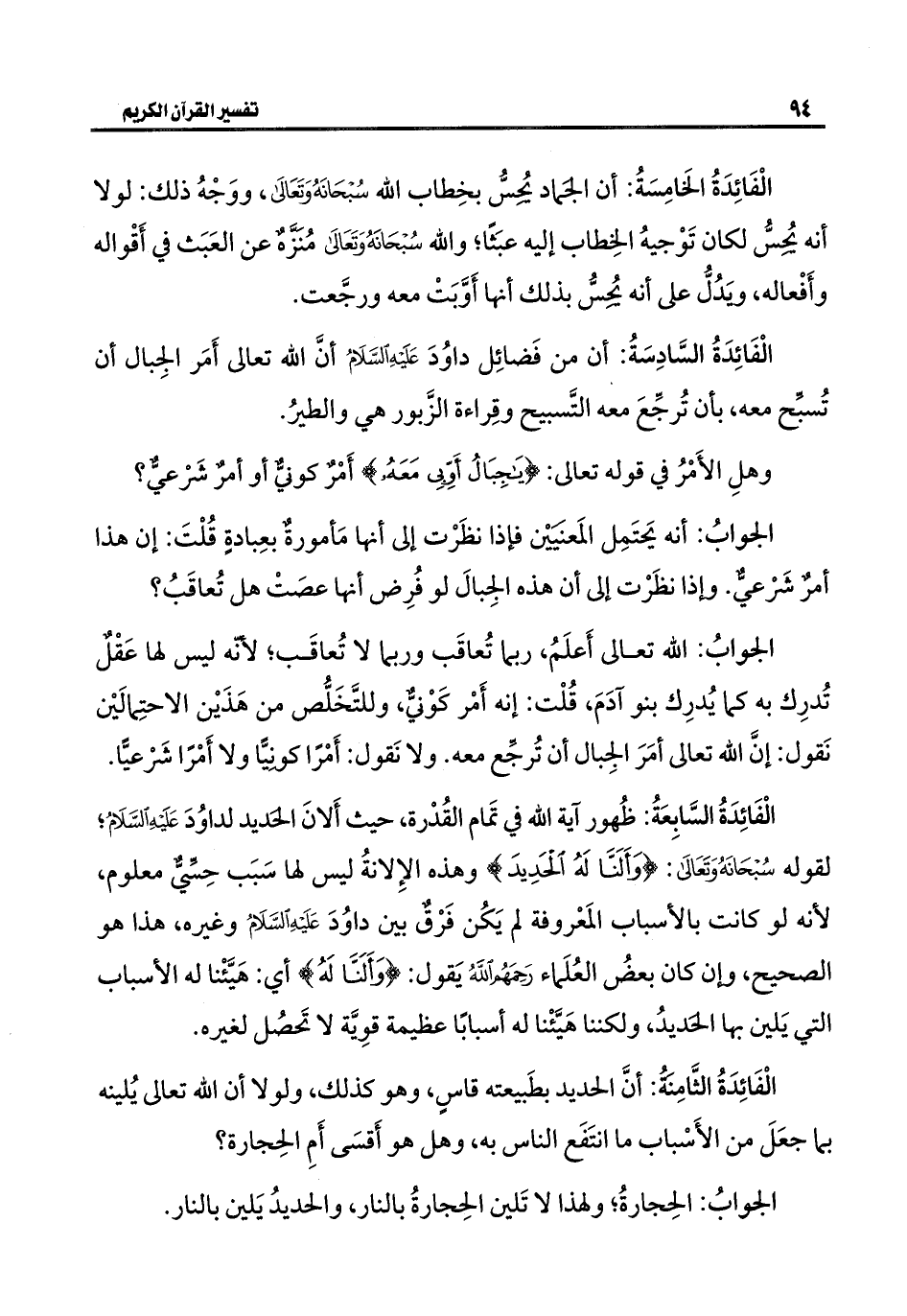 الفائِدةُ الخَامِسَةُ: أن الجَماد يُحِسُّ بخِطاب الله سُبْحَانَهُ وَتَعَالَى، ووَجْهُ ذلك: لولا أنه يُحِسُّ لكان تَوْجيهُ الخِطاب إليه عبَثًا؛ والله سُبْحَانَهُ وَتَعَالَى مُنزَّهٌ عن العَبَث في أَقْواله وأَفْعاله، ويَدُلُّ على أنه يُحِسُّ بذلك أنها أَوَّبَتْ معه ورجَّعت.