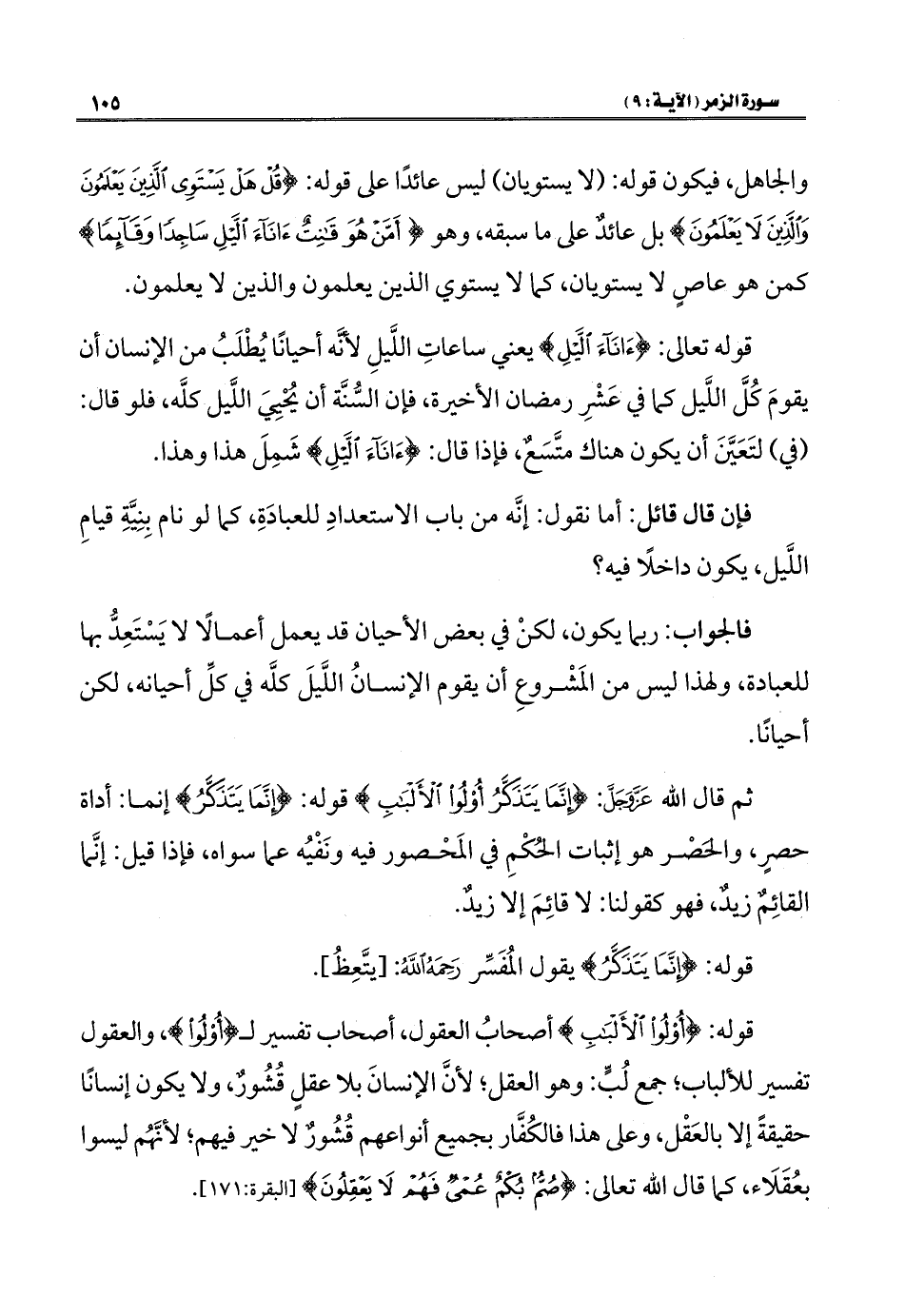 والجاهل، فيكون قوله: (لا يستويان) ليس عائدًا على قوله: {قُلْ هَلْ يَسْتَوِي الَّذِينَ يَعْلَمُونَ وَالَّذِينَ لَا يَعْلَمُونَ} بل عائدٌ على ما سبقه، وهو {أَمَّنْ هُوَ قَانِتٌ آنَاءَ اللَّيْلِ سَاجِدًا وَقَائِمًا} كمن هو عاصٍ لا يستويان، كما لا يستوي الذين يعلمون والذين لا يعلمون.