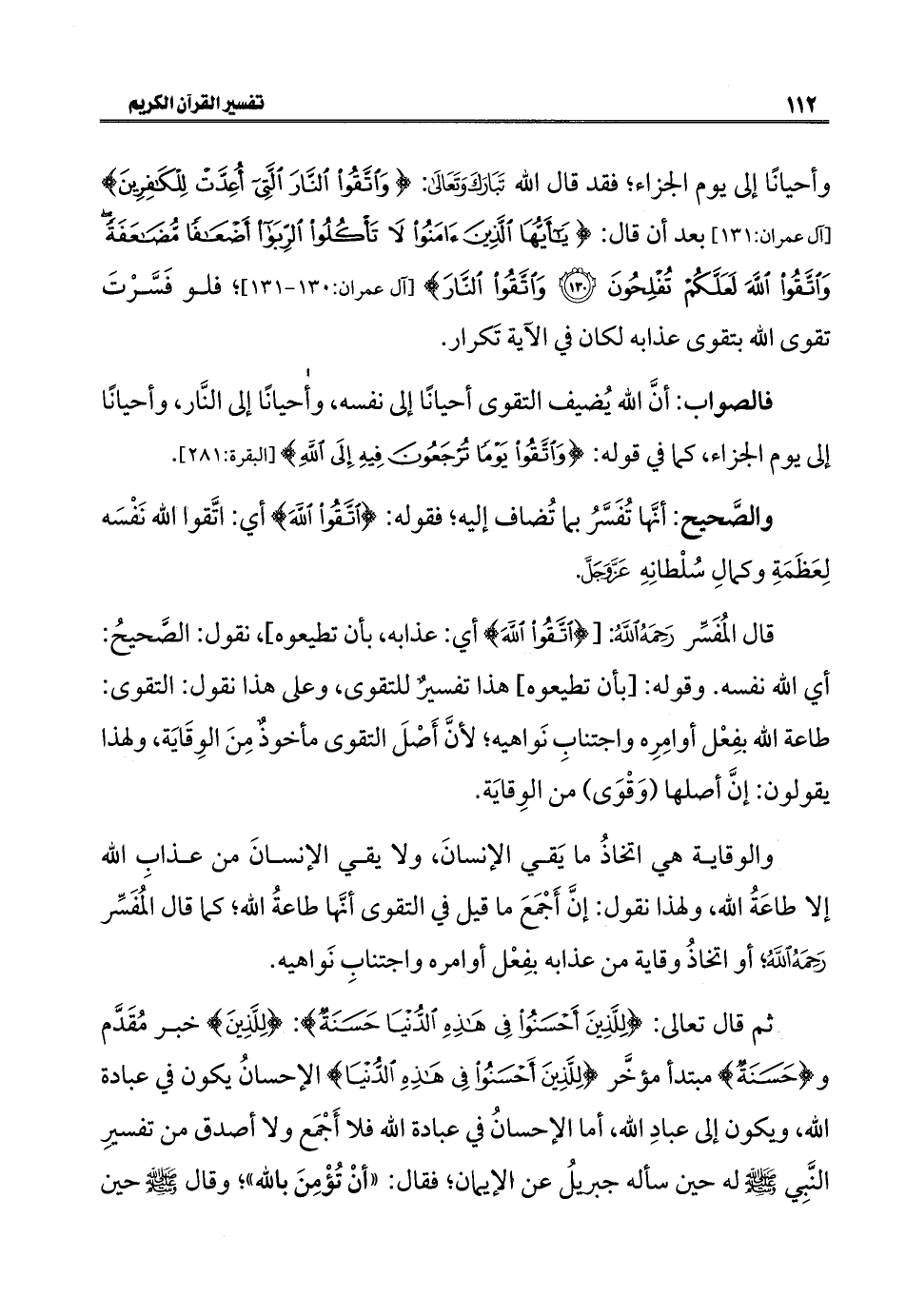 فالصواب: أنَّ الله يُضيف التقوى أحيانًا إلى نفسه، وأحيانًا إلى النَّار، وأحيانًا إلى يوم الجزاء، كما في قوله: {وَاتَّقُوا يَوْمًا تُرْجَعُونَ فِيهِ إِلَى اللَّهِ} [البقرة: ٢٨١].