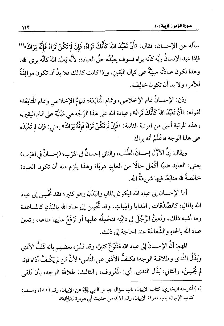 سأله عن الإحسان، فقال: "أَنْ تَعْبُدَ اللهَ كَأَنَّكَ تَرَاهُ، فَإِنْ لَمْ تَكُنْ تَرَاهُ فَإِنَّهُ يَرَاكَ" (١) فإذا عبد الإنسانُ ربَّه كأنه يراه فسوف يعبُدُه حقَّ العبادة؛ لأنَّه يَعبُد اللهَ كأنَّه يرى الله، وهذا تكون عبادَتُه مبنِيَّةً على كمال اليَقينِ، وإذا كانت كذلك فلا بدَّ أن تكون موافِقَةً للأمر، ولا بد أن تكون خالِصَة.