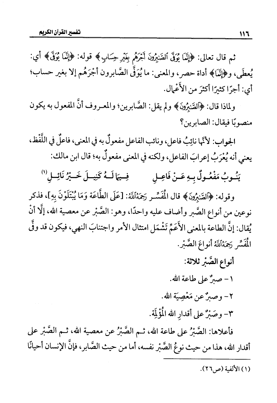 وقوله: {الصَّابِرُونَ} قال المُفَسِّر رَحِمَهُ اللهُ: [عَلَى الطَّاعَة وَمَا يُبْتَلَوْنَ بِهِ]، فذكر نوعين من أنواع الصَّبر وأضاف عليه واحدًا، وهو: الصَّبْر عن معصية الله، إلَّا أنْ يُقال: إنَّ الطاعة بالمعنى الأَعَمِّ تَشْمَل امتثال الأمر واجتنابَ النهي، فيكون قد وفَّى المُفَسِّر رَحِمَهُ اللهُ أنواعَ الصَّبْر.